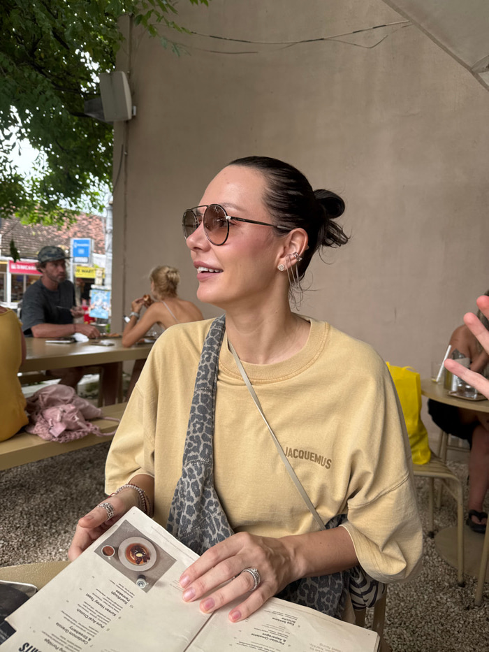 The image captures a woman seated at an outdoor cafe in Uluwatu, Indonesia, engaged in perusing a menu. The woman, positioned in the mid-left foreground, has dark hair pulled back, wears brown-tintedβ¦read more