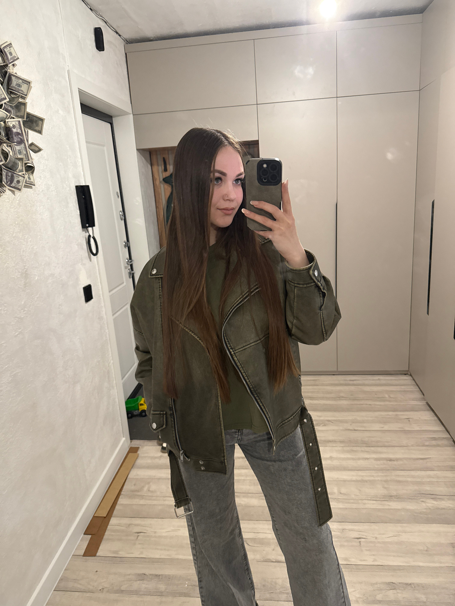 A woman stands in a room, holding a smartphone up to take a selfie in front of a mirror. She is wearing a green jacket and gray jeans. The background features a wardrobe, wood-like flooring, and a whi…read more