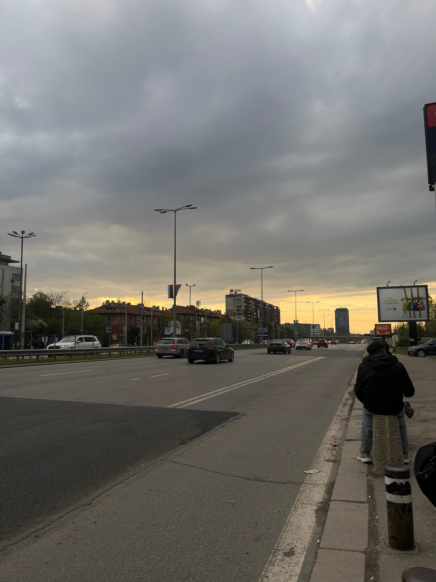 An urban street scene unfolds during what appears to be late afternoon or early evening, likely sunset, in Sofia, Bulgaria. The image captures a multi-lane asphalt road with white lane markings, popul…read more