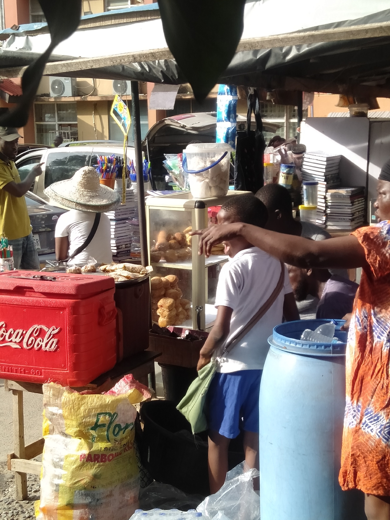 The image shows a street food stall in Lagos, Nigeria. A vendor wearing an orange patterned dress gestures with her right hand towards the stall, where a young boy in a white shirt and blue shorts sta…read more