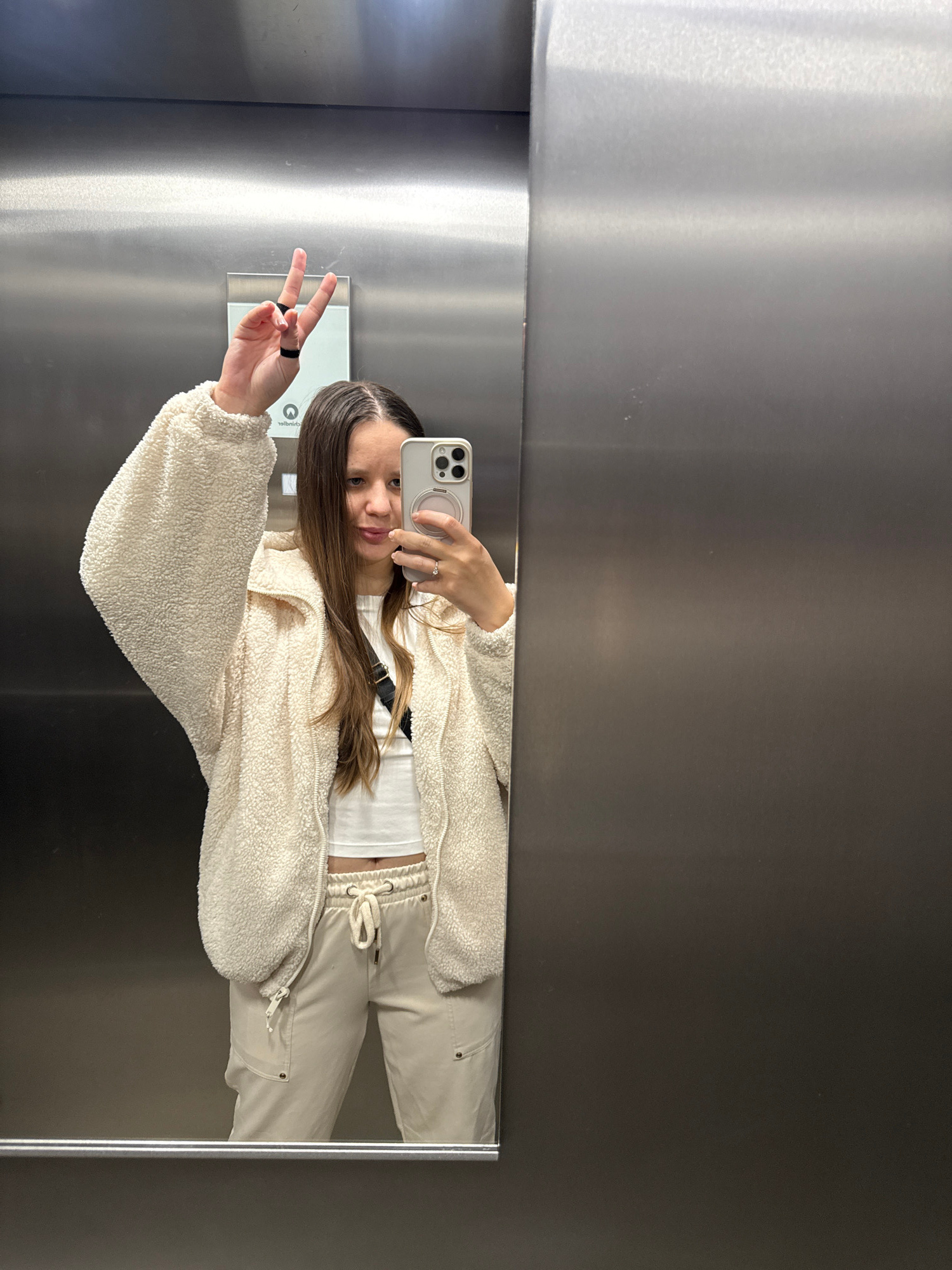 A woman is taking a selfie in an elevator. She's making a peace sign with her left hand and holding a smartphone in her right. She is wearing a white crop top, cream-colored pants with a drawstring wa…read more
