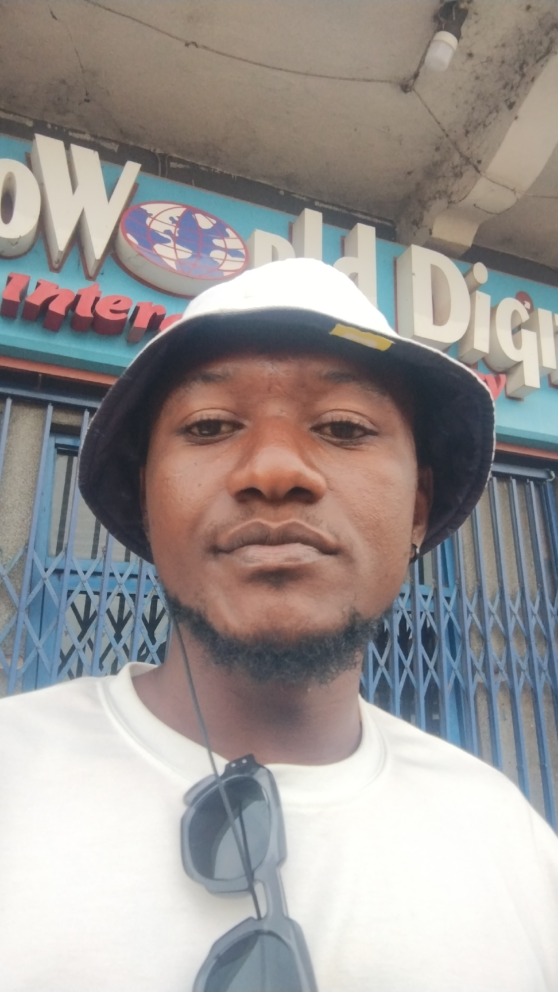 A man with dark skin, a short black beard, and wearing a white T-shirt and a white bucket hat with a dark brim, is photographed outdoors in Jos, Nigeria. Sunglasses are hanging off the shirt. The back…read more