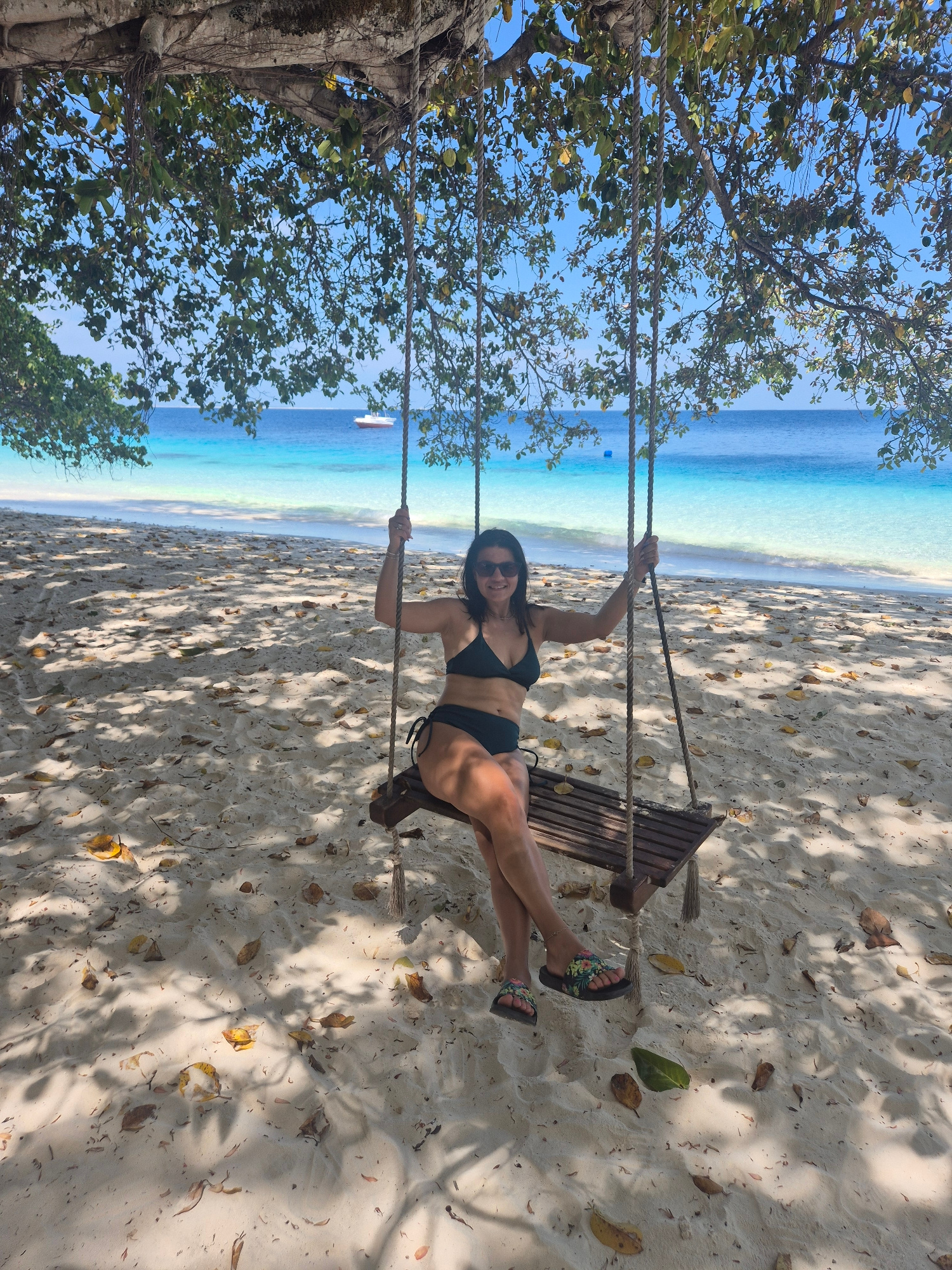 A woman in a black bikini sits on a swing suspended from a tree on a beach in Guraidhoo, Maldives. She is wearing sunglasses and sandals. The sand is white and covered with leaves. The water is turquo…read more