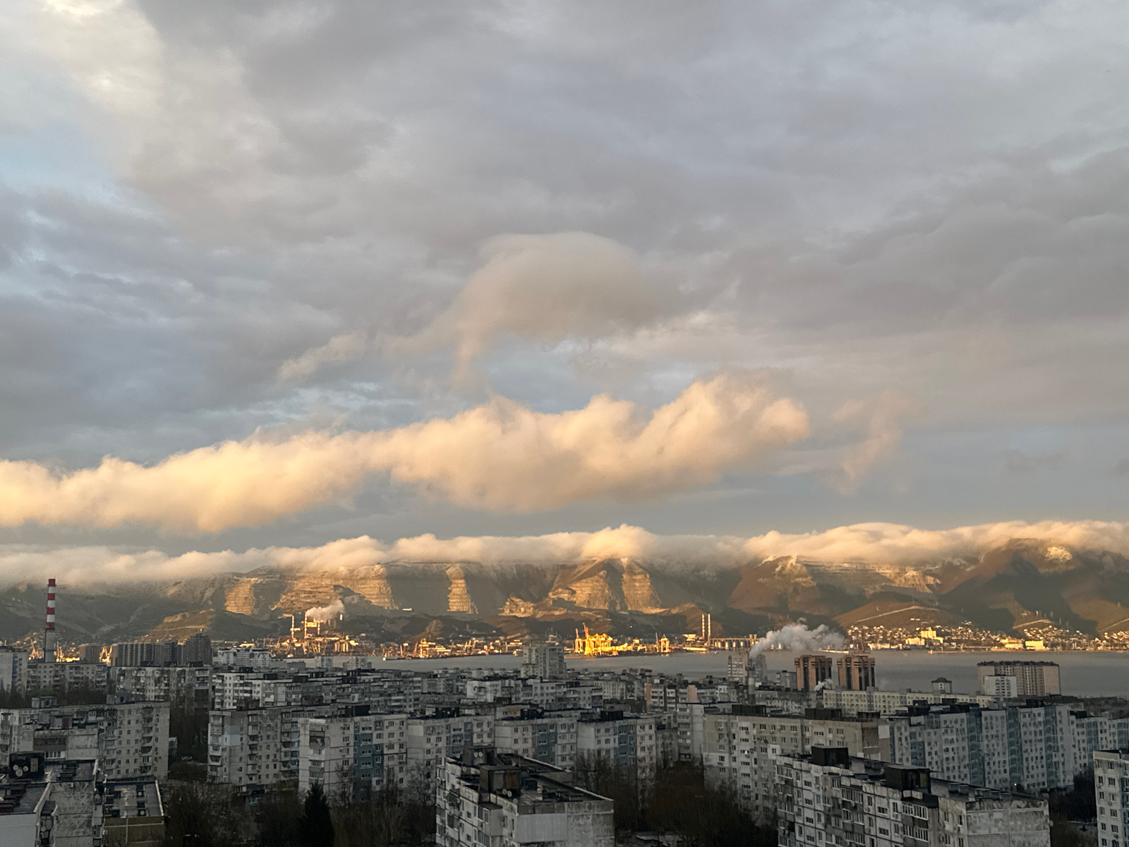 The image presents an elevated view of a cityscape in Novorossiysk, Russia, likely taken from a high-rise building. In the foreground, there are multiple Soviet-era apartment buildings with a repetiti…read more