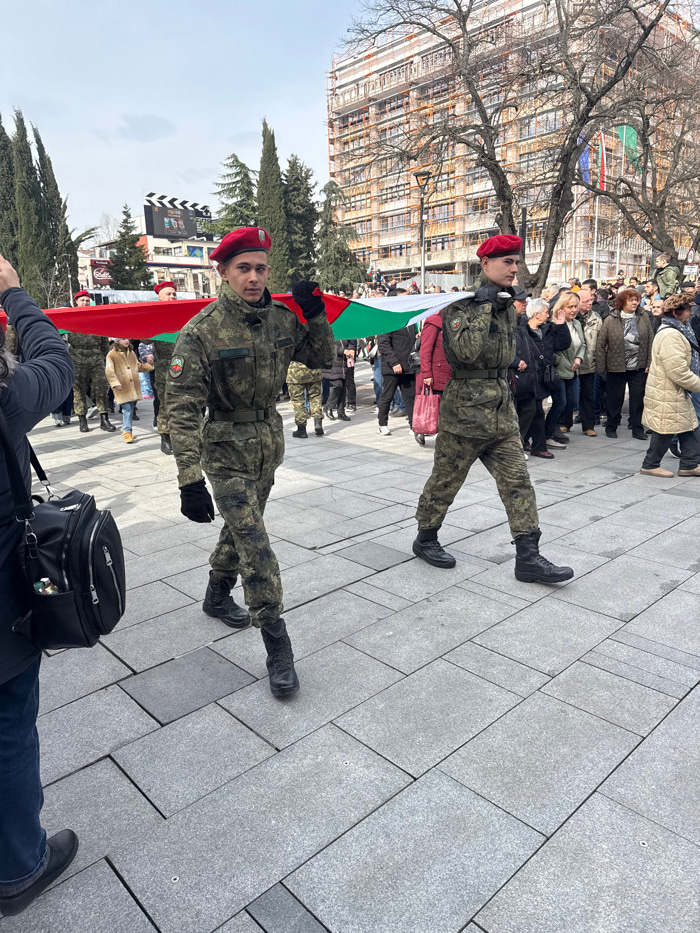 An outdoor scene in Stara Zagora, Bulgaria, depicts two young males in Bulgarian military camouflage uniforms, red berets, black gloves, and black combat boots, marching on a paved square. They are ce…read more
