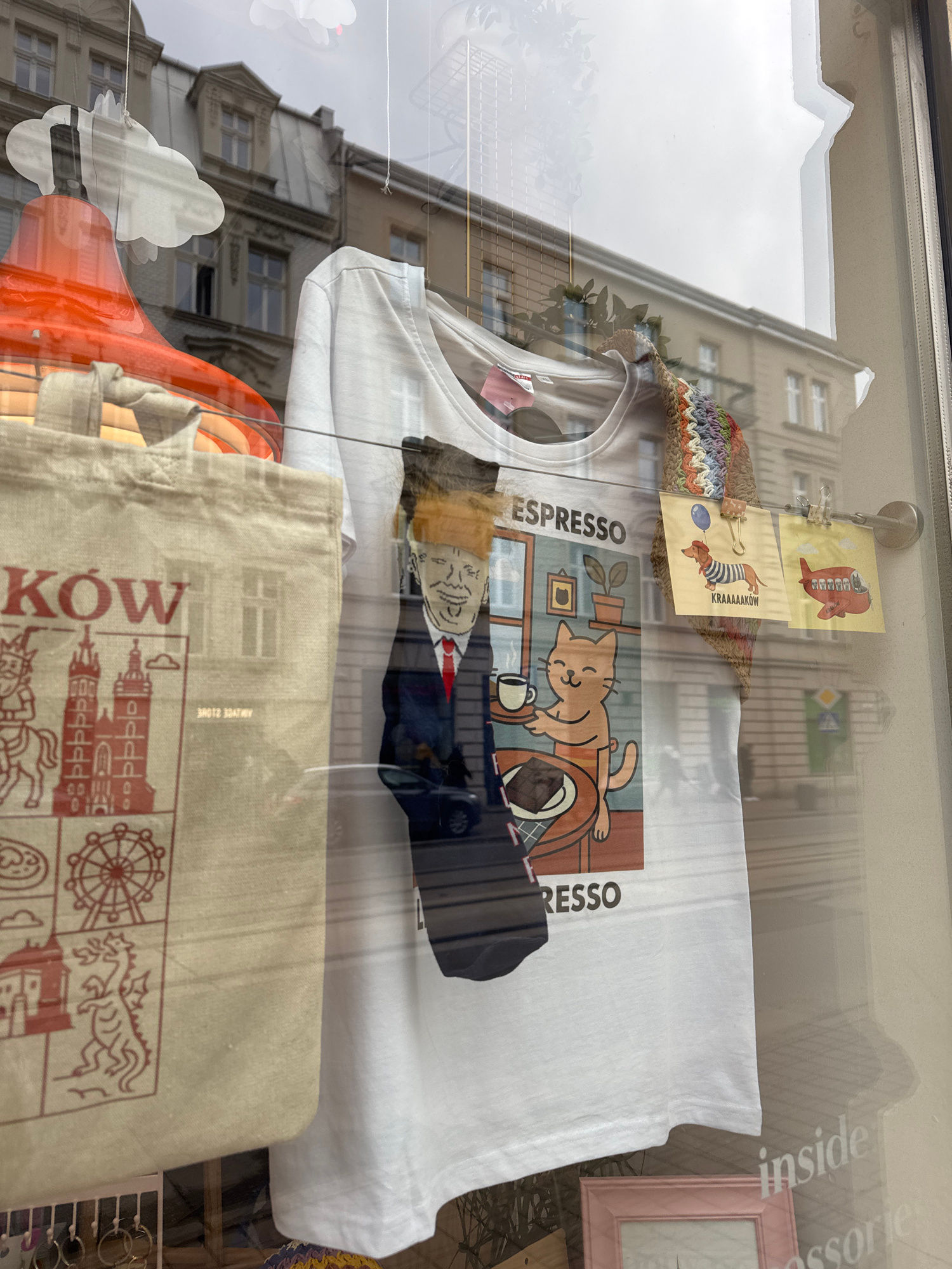 A display window in Krakow, Poland, showcases a white t-shirt with a graphic of a cat on a table drinking from a cup, accompanied by the word "Espresso." Also featured is a beige tote bag with "Kraków…read more