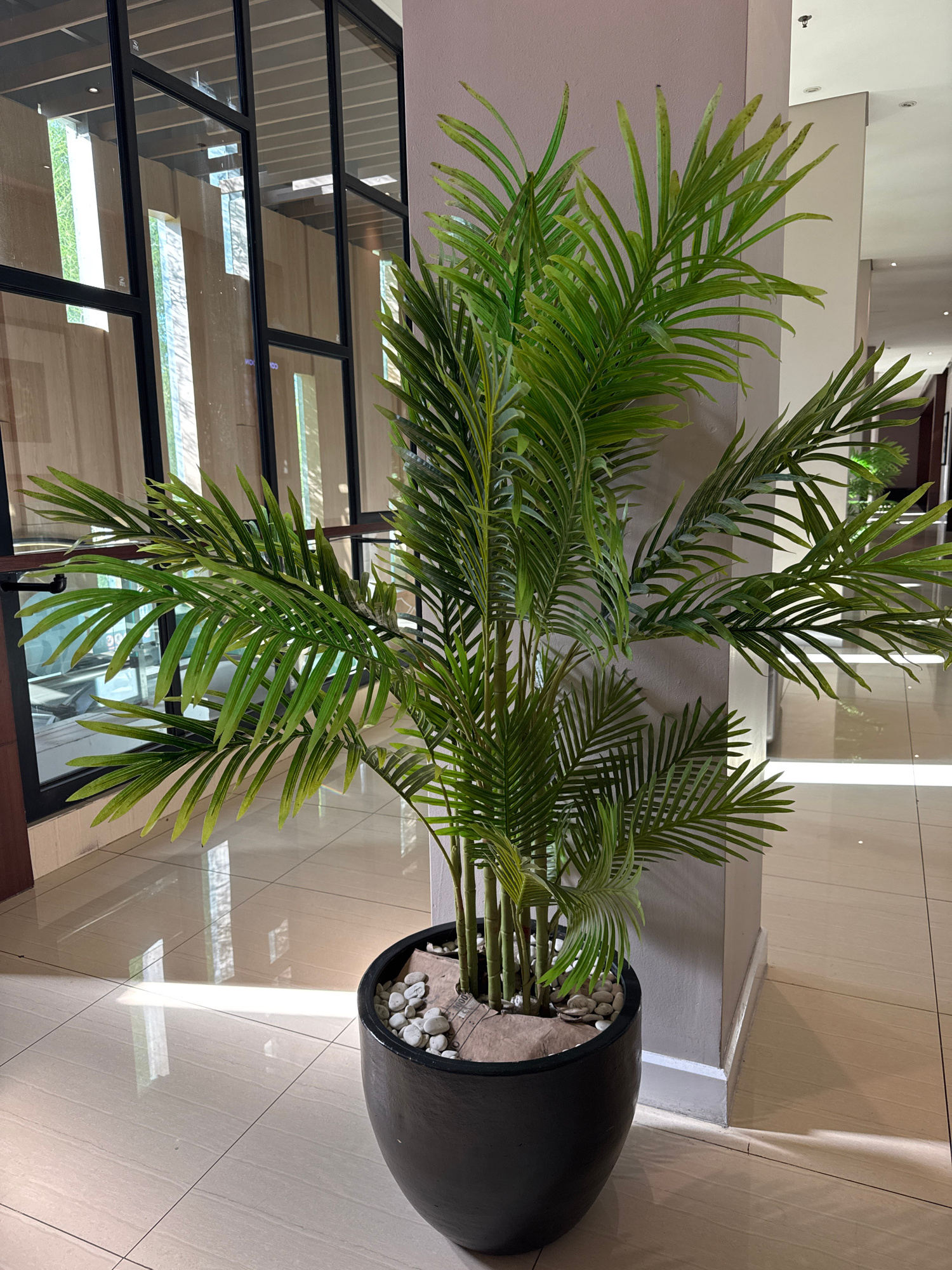 A large, vibrant green potted plant, likely an artificial palm, is the central subject of this indoor scene. The plant features numerous feathery fronds, some with slight yellow-green variations, exte…read more