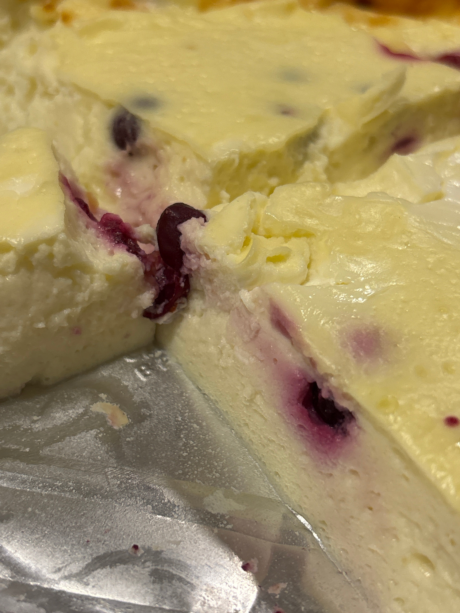 A close-up shot depicts a section of what appears to be a blueberry cheesecake. The dessert is light yellow in color with visible purple blueberry inclusions. The texture of the cake is soft and cream…read more