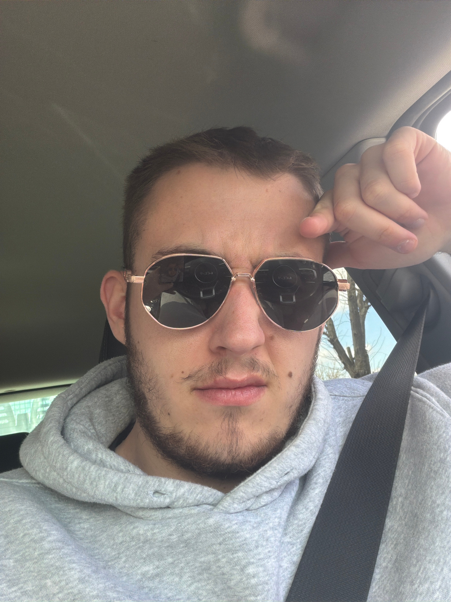 A close-up, tilted selfie of a young man wearing sunglasses and a grey hooded sweatshirt, with a black seatbelt visible across his chest. His left hand is raised near his forehead. The reflection in h…read more