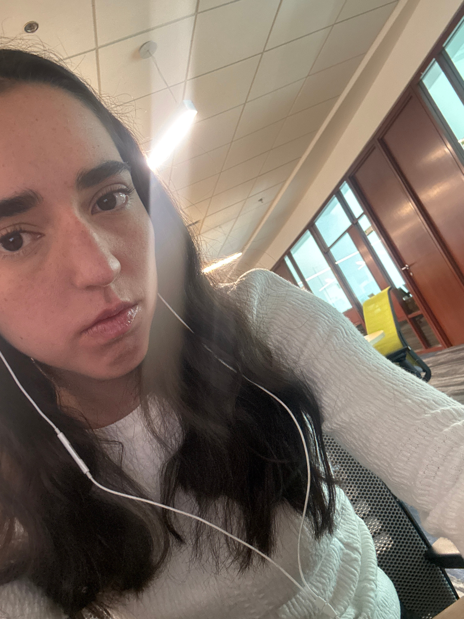 An adult female is depicted in a close-up, angled self-portrait within an indoor commercial or office environment. She has long, dark brown hair, dark eyes, and a neutral expression, looking directly…read more