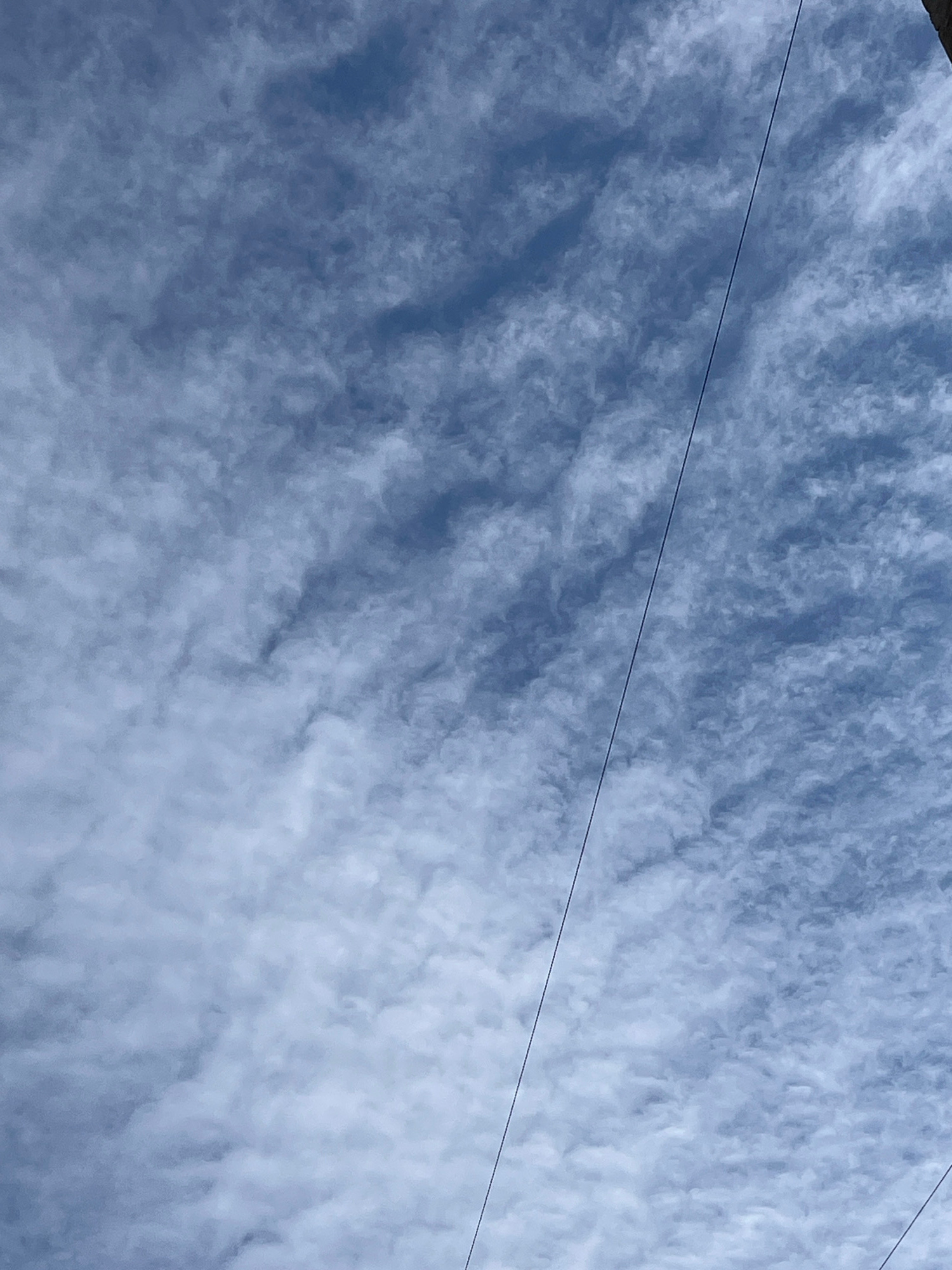 The image shows a blue sky covered with altocumulus clouds. A thin, straight electrical wire runs diagonally across the frame from the upper left to the lower right. There are no people or other objec…read more