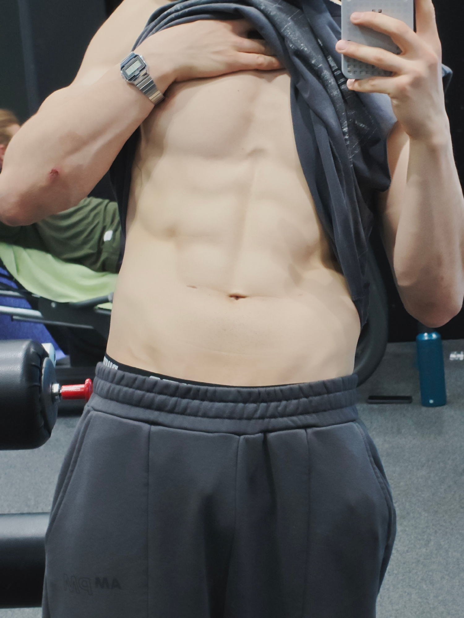 A person with a muscular physique, likely male, takes a mirror selfie in an indoor gym in Sofia, Bulgaria. The subject is shown from the chest down, with their grey t-shirt lifted to reveal defined ab…read more