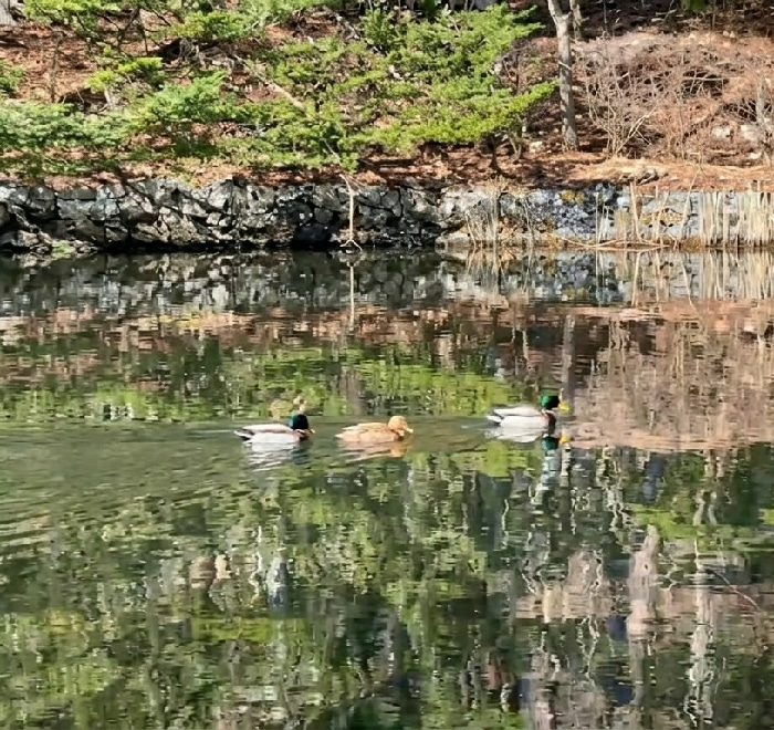 This image depicts a natural pond or calm body of water located in Karuizawa, Japan, under daylight conditions. Three ducks are present on the water's surface. On the far left, a mallard drake with a…read more