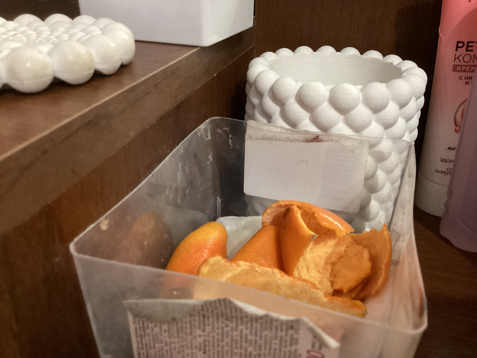 The image shows a close-up of a clear plastic container holding orange peels and newspaper. The container is positioned next to a white, bubble-textured pot and a cosmetic bottle with Russian text. Th…read more