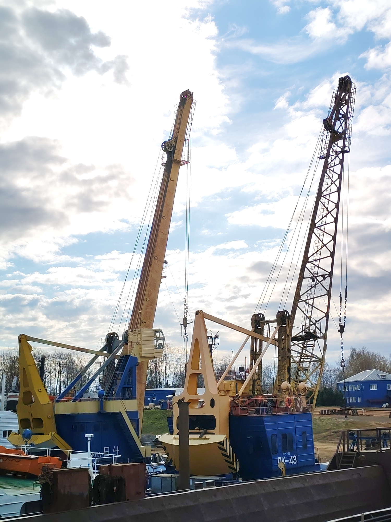 The image depicts two floating cranes, one with a lattice boom and the other with a solid boom, docked on a barge. The cranes are painted in yellow and blue. A building is visible in the background. T…read more