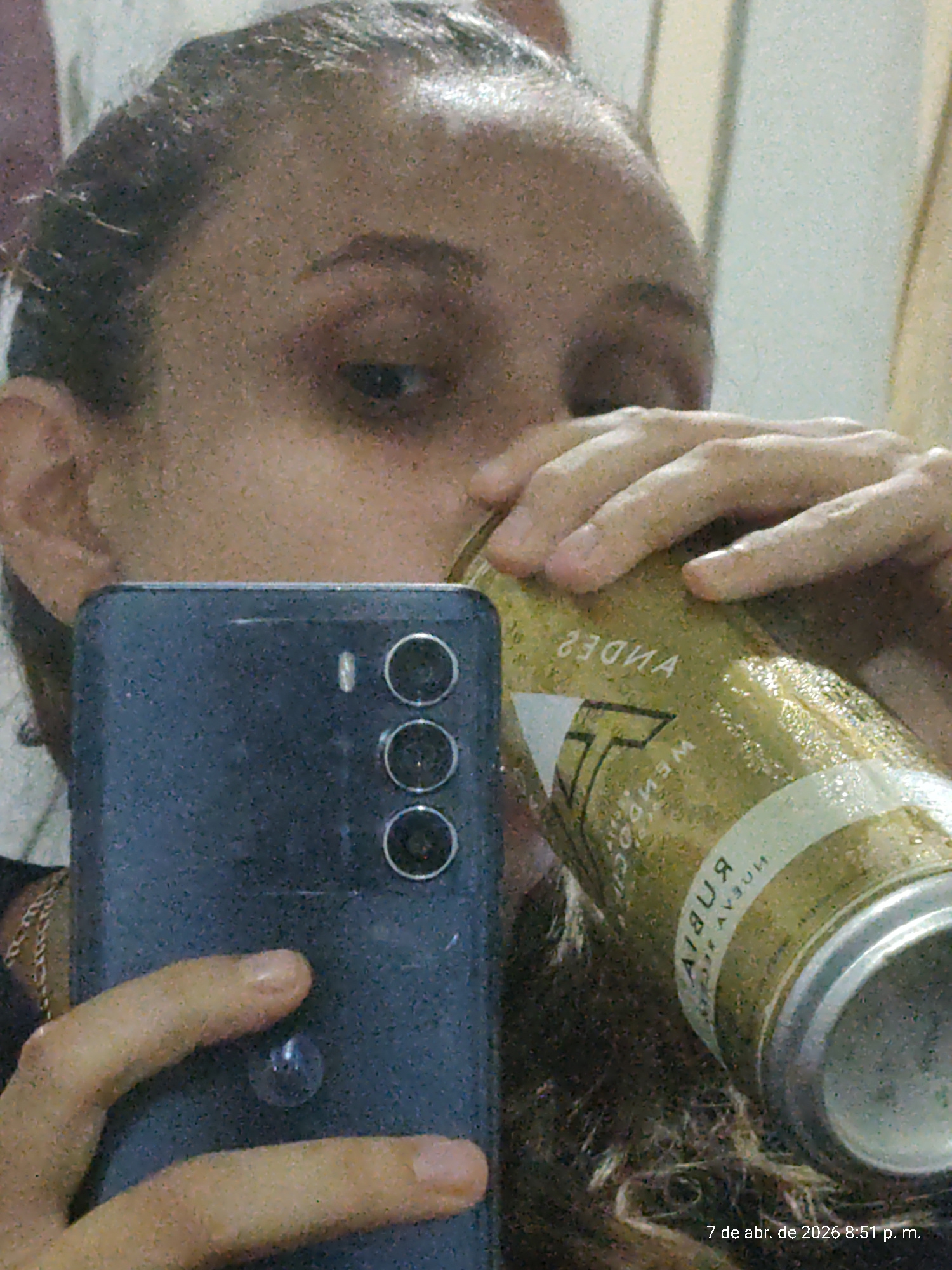 A person is holding a can of Andes Origen Rubia beer and a black cell phone. The photo was taken on April 7, 2026, at 8:51 p.m. The location is unknown; however, the can of beer suggests the person ma…read more