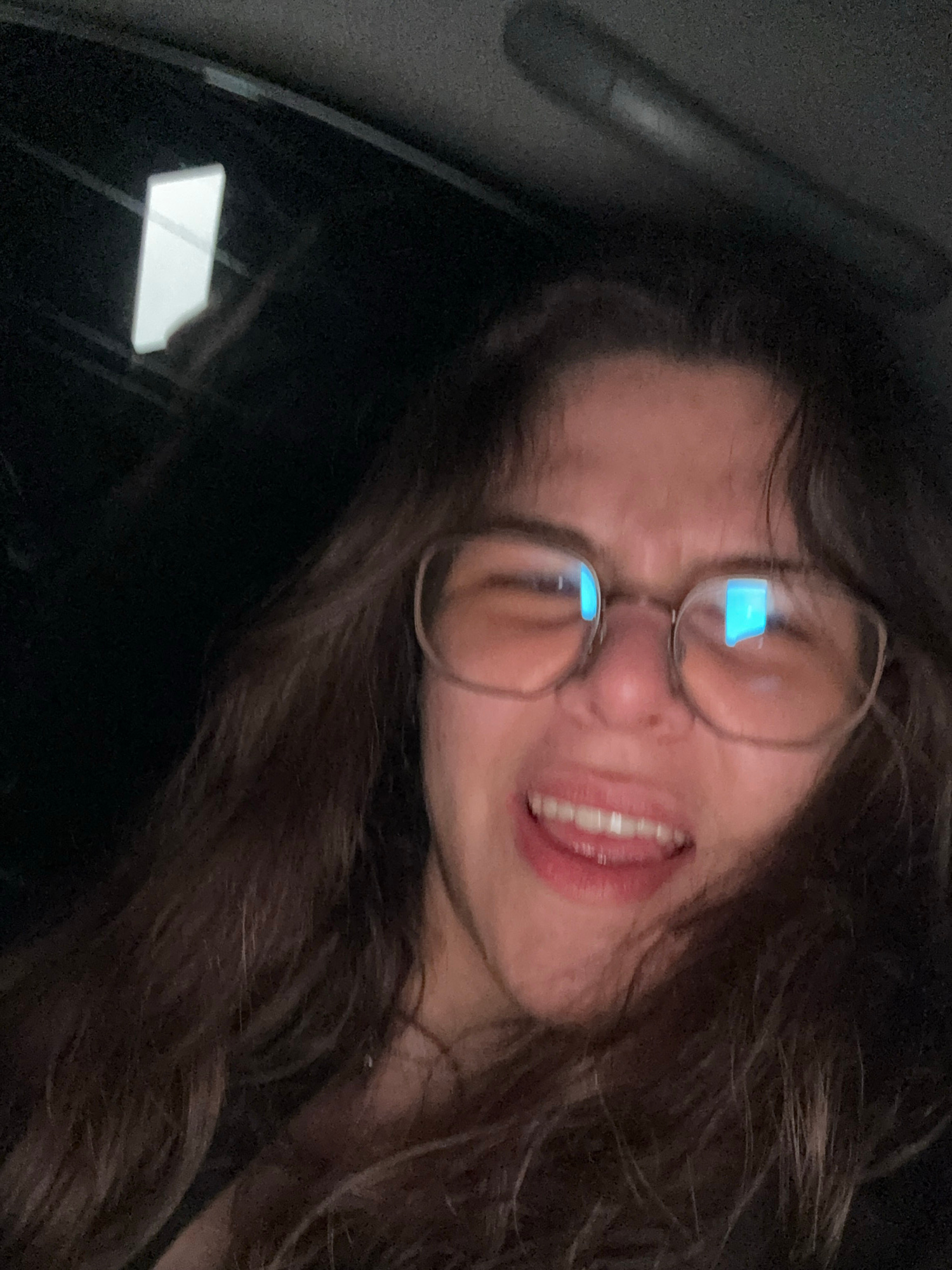 A person with dark brown hair and eyeglasses is smiling in the photo. The person appears to be inside a car due to the reflection on the window. The photo is taken at an angle. There is no information…read more
