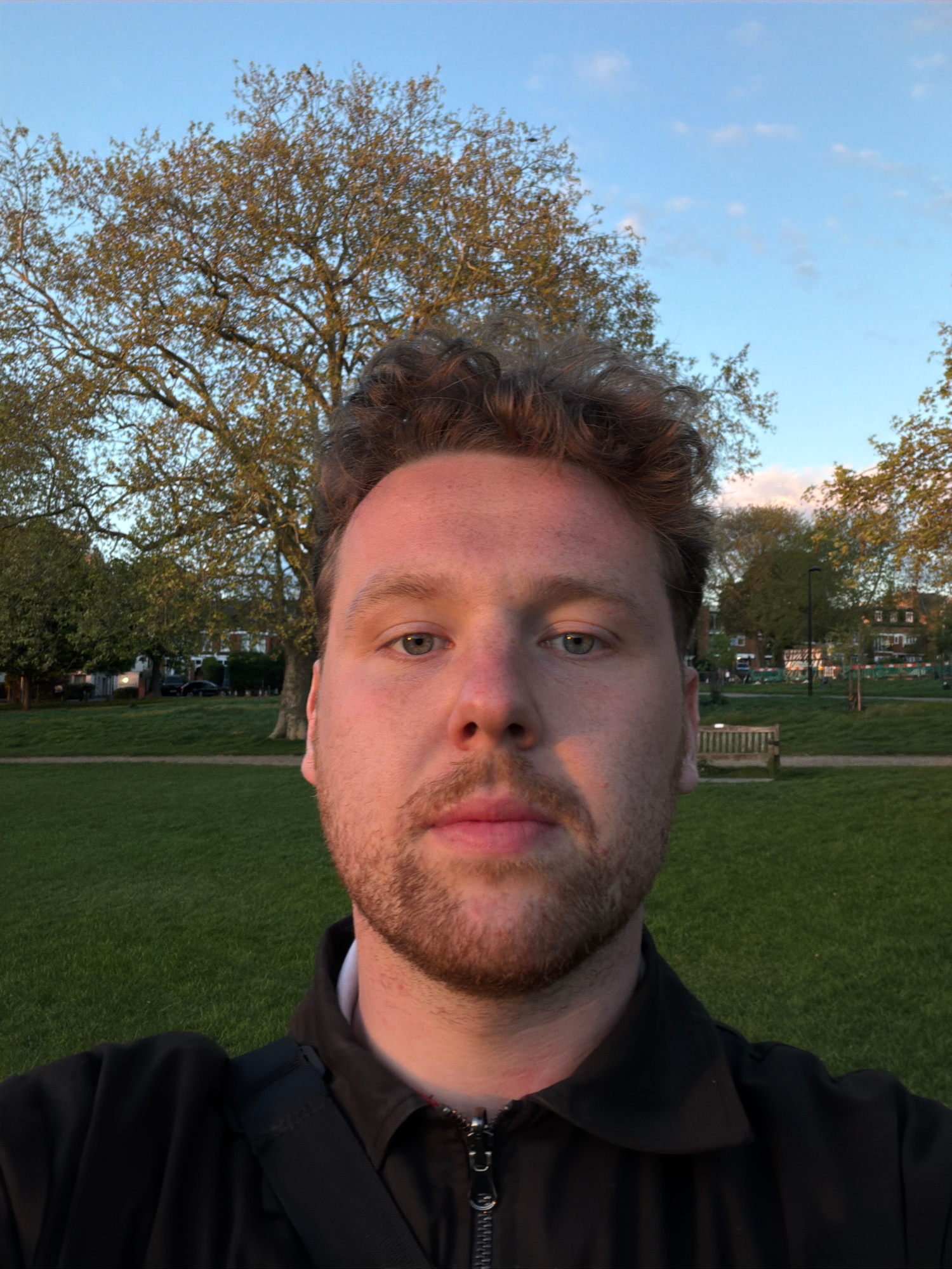 A selfie-style image features a fair-skinned male with brown hair and a beard. The photo appears to be taken in a park or green space, given the presence of green grass, a large tree with visible bran…read more