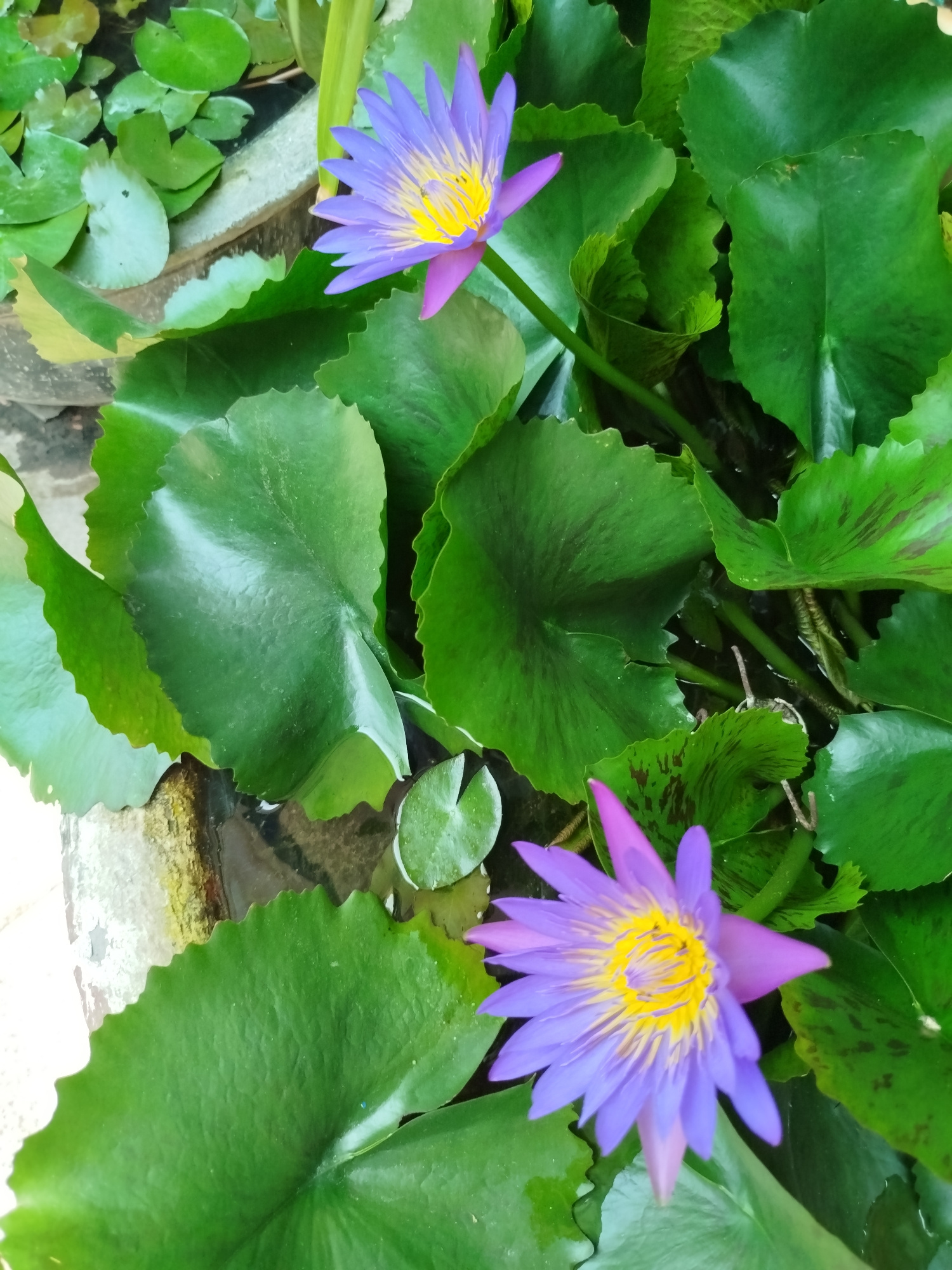 The image shows two purple water lilies with yellow centers blooming among large, green lily pads. They appear to be in a pond or container, with water visible between the leaves. The image was taken…read more
