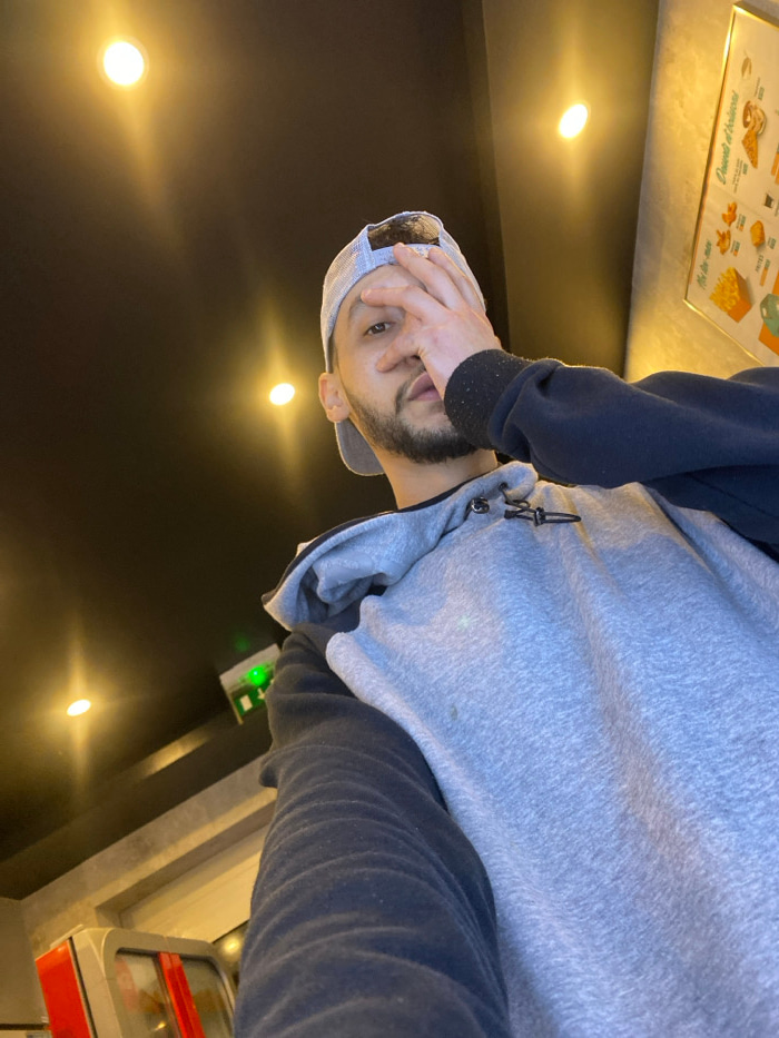 A person wearing a grey hooded sweatshirt and a backwards baseball cap covers their face with their hand, looking towards the camera. The background features a dark ceiling with several recessed lightβ¦read more