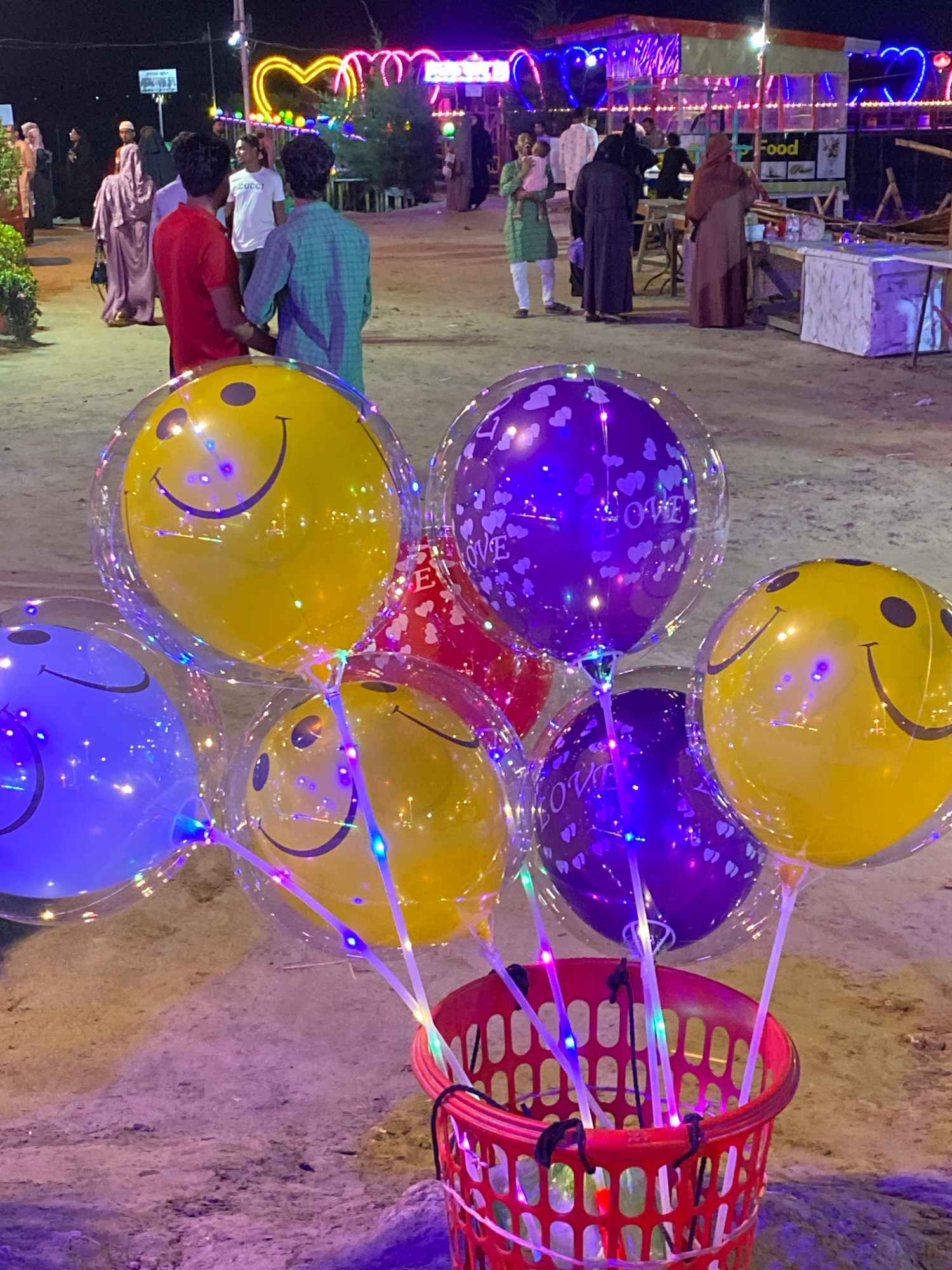 The image shows a street scene in Dhaka, Bangladesh. A red plastic basket containing a collection of illuminated balloons with smiley faces is prominent. The balloons are in varying colors, including…read more