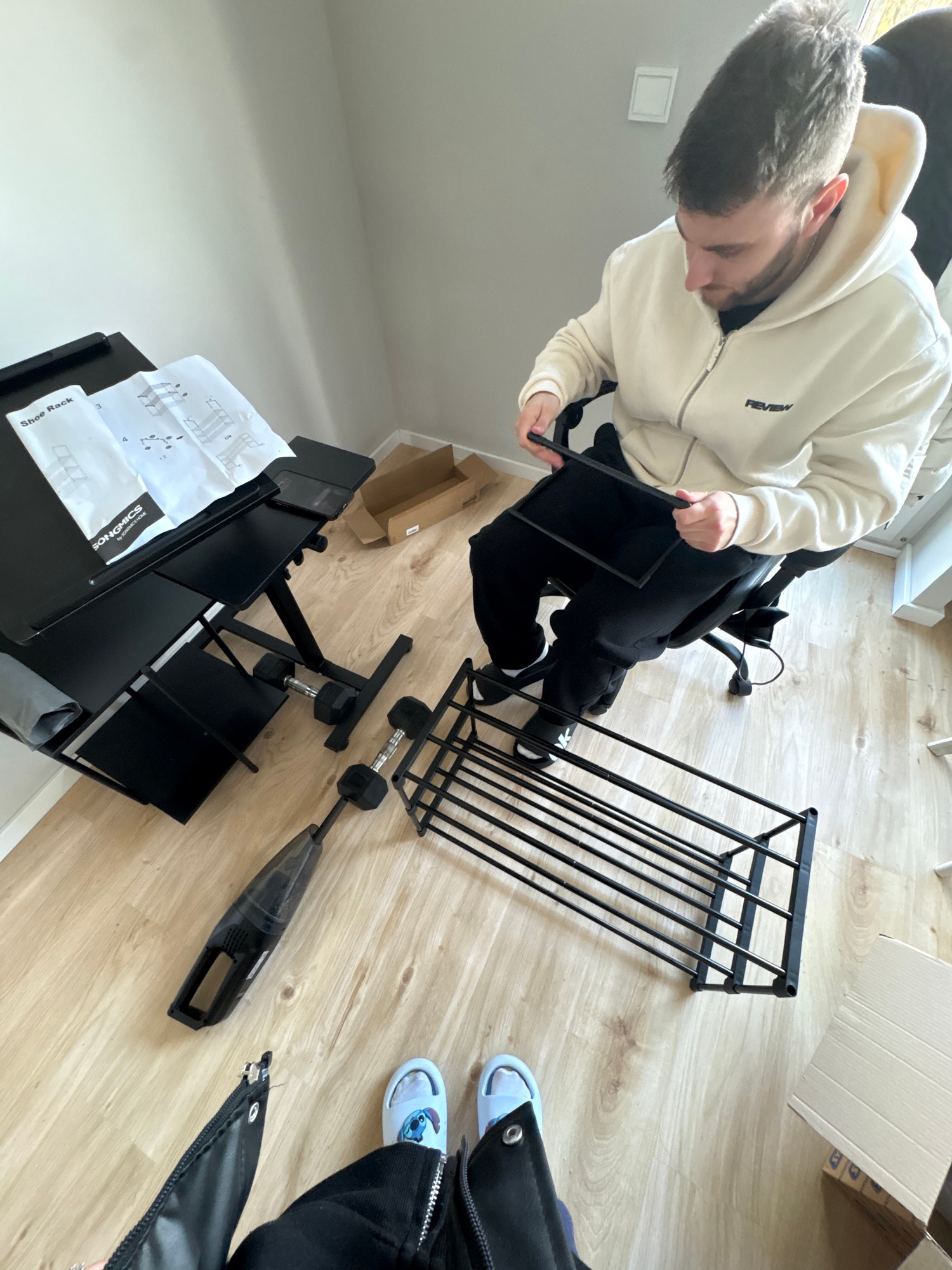 A person is assembling a black shoe rack in an indoor environment. The person is wearing a light-colored hoodie and black pants. The floor is light wood. Assembly instructions for a "SONGMICS Shoe Rac…read more