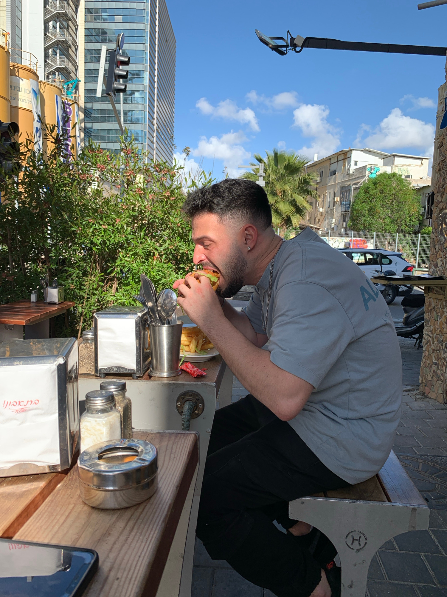 A man with dark hair and a beard is bending over to eat a burger and fries at an outdoor table. The table is set with condiments and napkins. In the background, there is a green tree and a city street…read more
