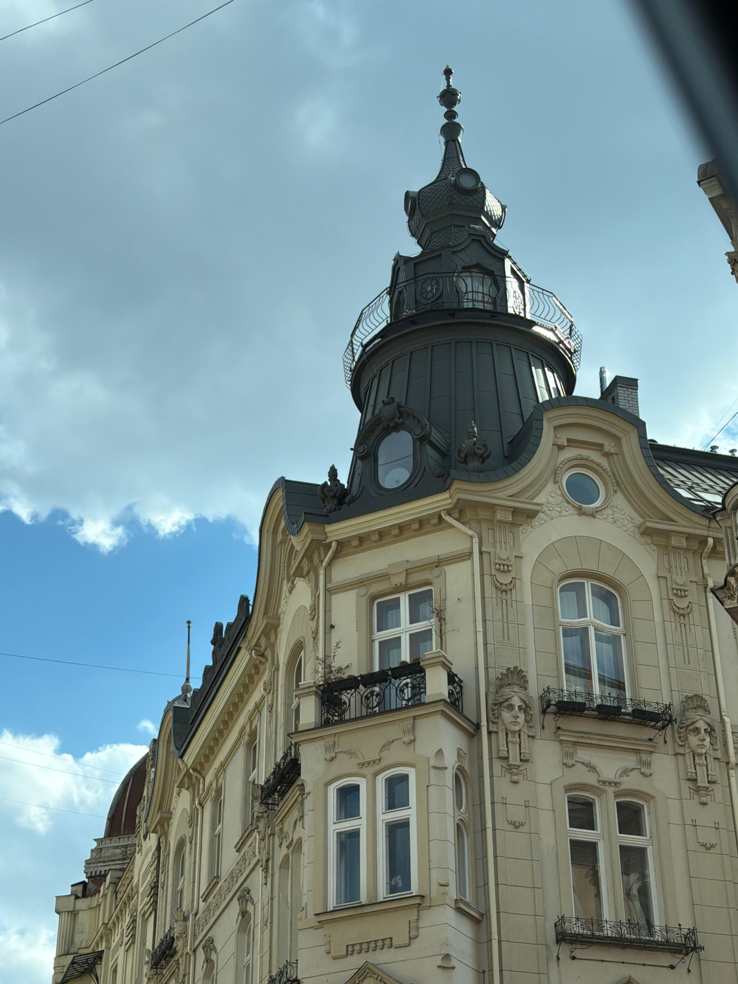 An upward-angled, daytime photograph captures a section of a richly ornamented historic building set against a dynamic sky. The building, characteristic of architecture found in Lviv, Ukraine, feature…read more