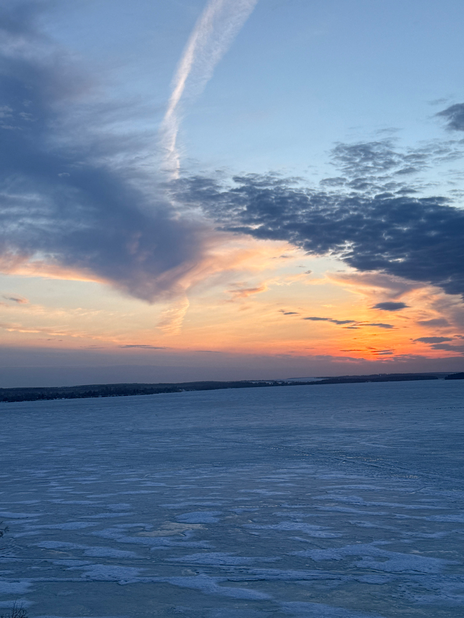 The image depicts a frozen body of water, possibly a lake or river, adjacent to a city. The sky displays a dramatic sunset with a mix of dark, textured clouds and orange-yellow hues. A contrail can be…read more