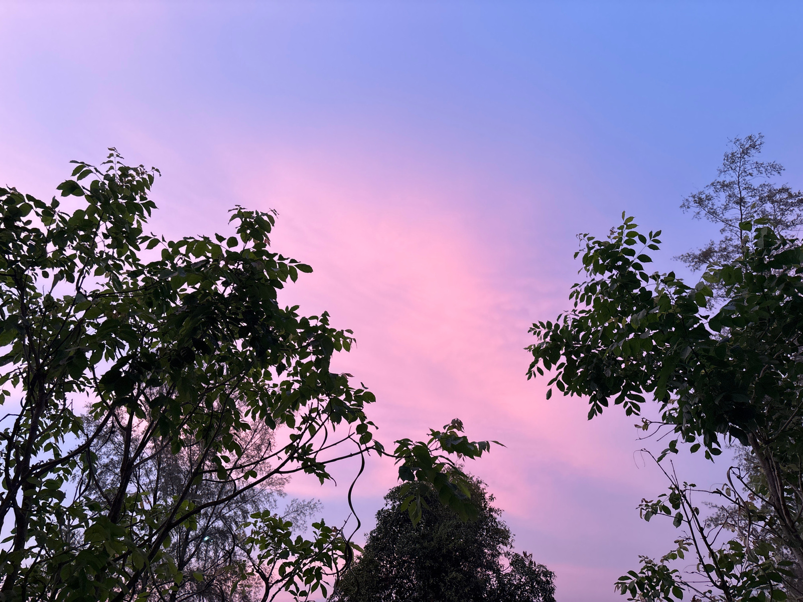The image depicts a view through treetops against a twilight sky. The sky's color transitions from a pale blue at the top to pink and lavender hues near the horizon. The tree leaves are green and dens…read more