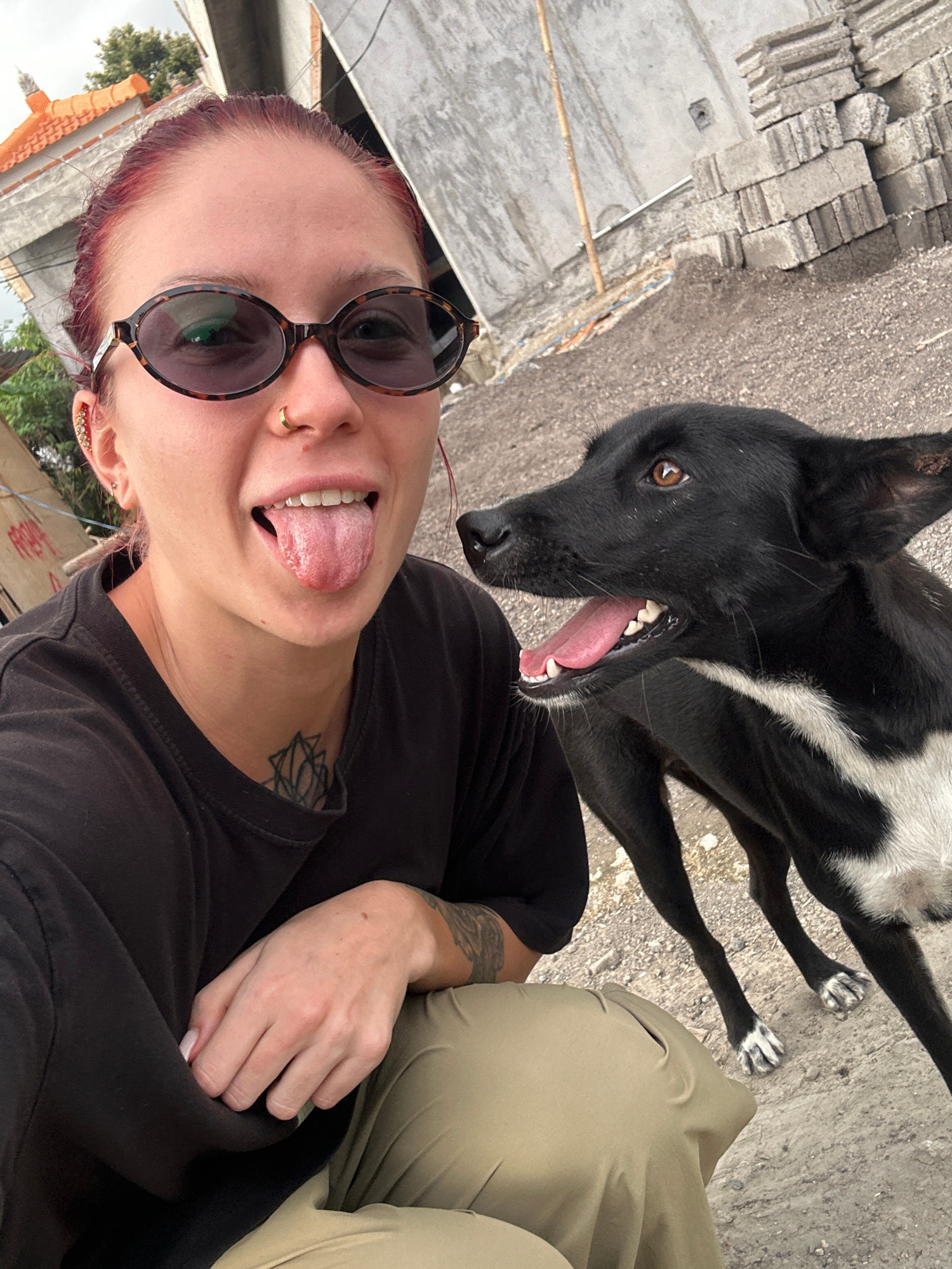 An individual with reddish-brown hair, dark tortoiseshell sunglasses, a gold nose ring, and multiple ear piercings is depicted crouching outdoors in Buduk, Indonesia. They are wearing a black t-shirt…read more