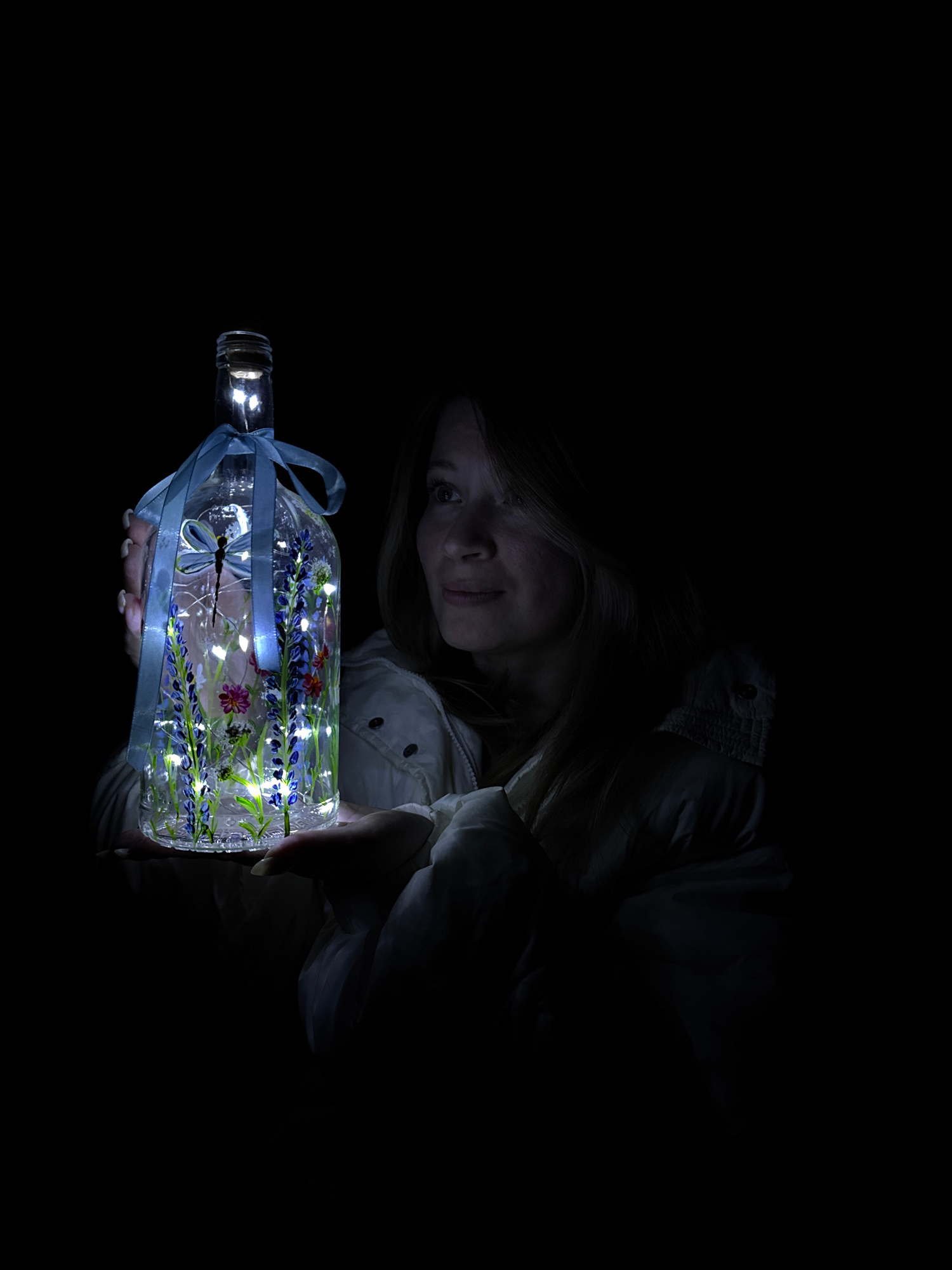 A dimly lit, low-angle shot depicts a woman holding a glowing bottle. The background is completely dark. The woman has fair skin and light hair. She wears a light-colored jacket. The bottle is made of…read more