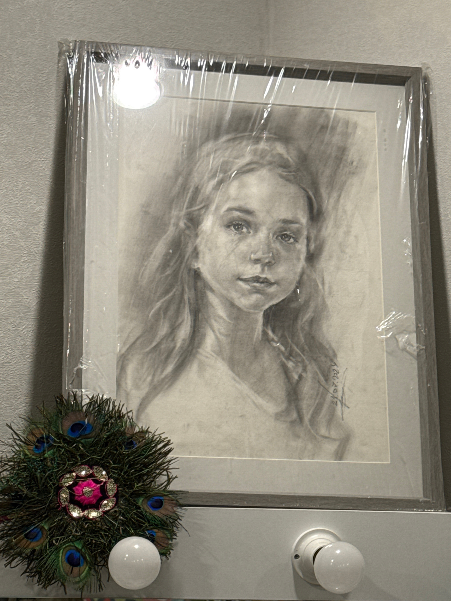 The image displays an indoor scene featuring a framed portrait drawing and several decorative elements. The central subject is a framed pencil or charcoal drawing of a young woman, depicted from the s…read more