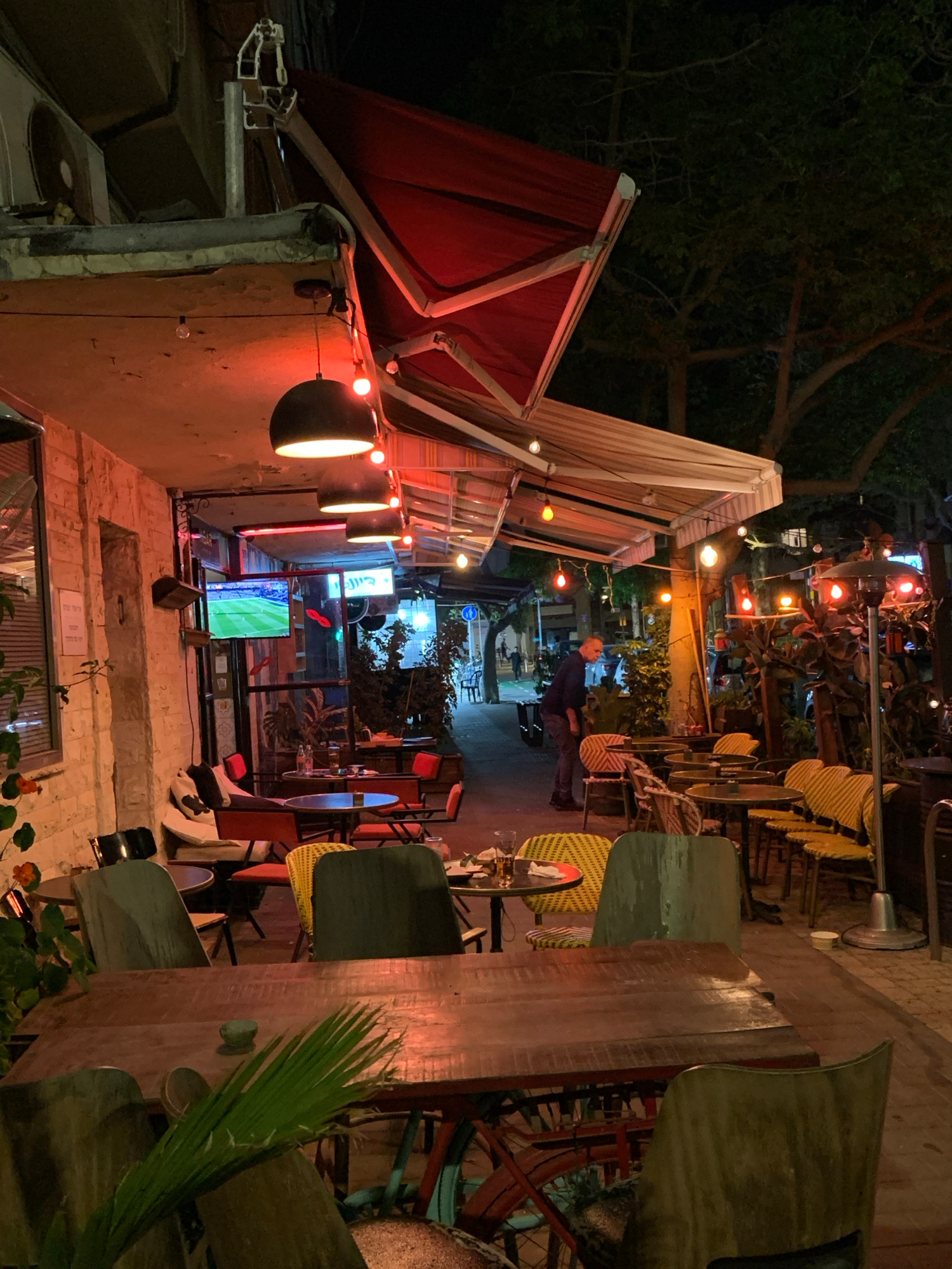 This nighttime image captures an inviting outdoor dining or bar area, likely in Tel Aviv, Israel. The scene is illuminated by numerous artificial light sources, including string lights, wall-mounted l…read more
