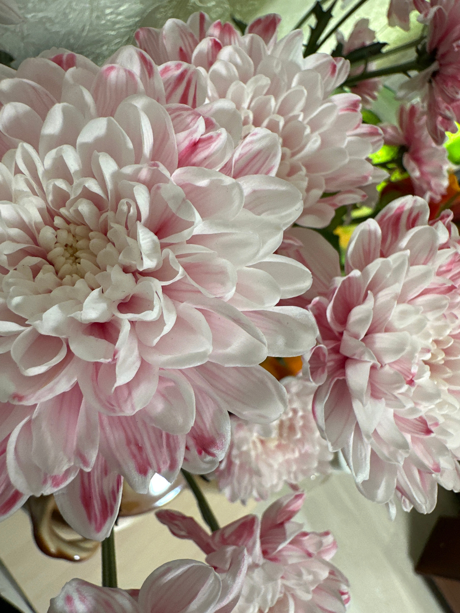 The image shows a close-up of a bouquet of pink and white chrysanthemum flowers. The flowers are in full bloom with many petals, and the pink color appears as stripes or edges on the white petals. The…read more