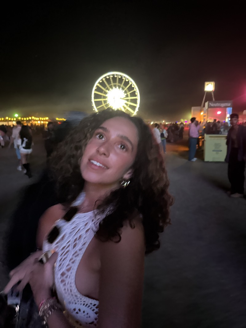 A woman is posing for a picture in Indio, United States, at night. She has curly brown hair and is wearing a white crochet top. A Ferris wheel is visible in the background. There are other people in t…read more