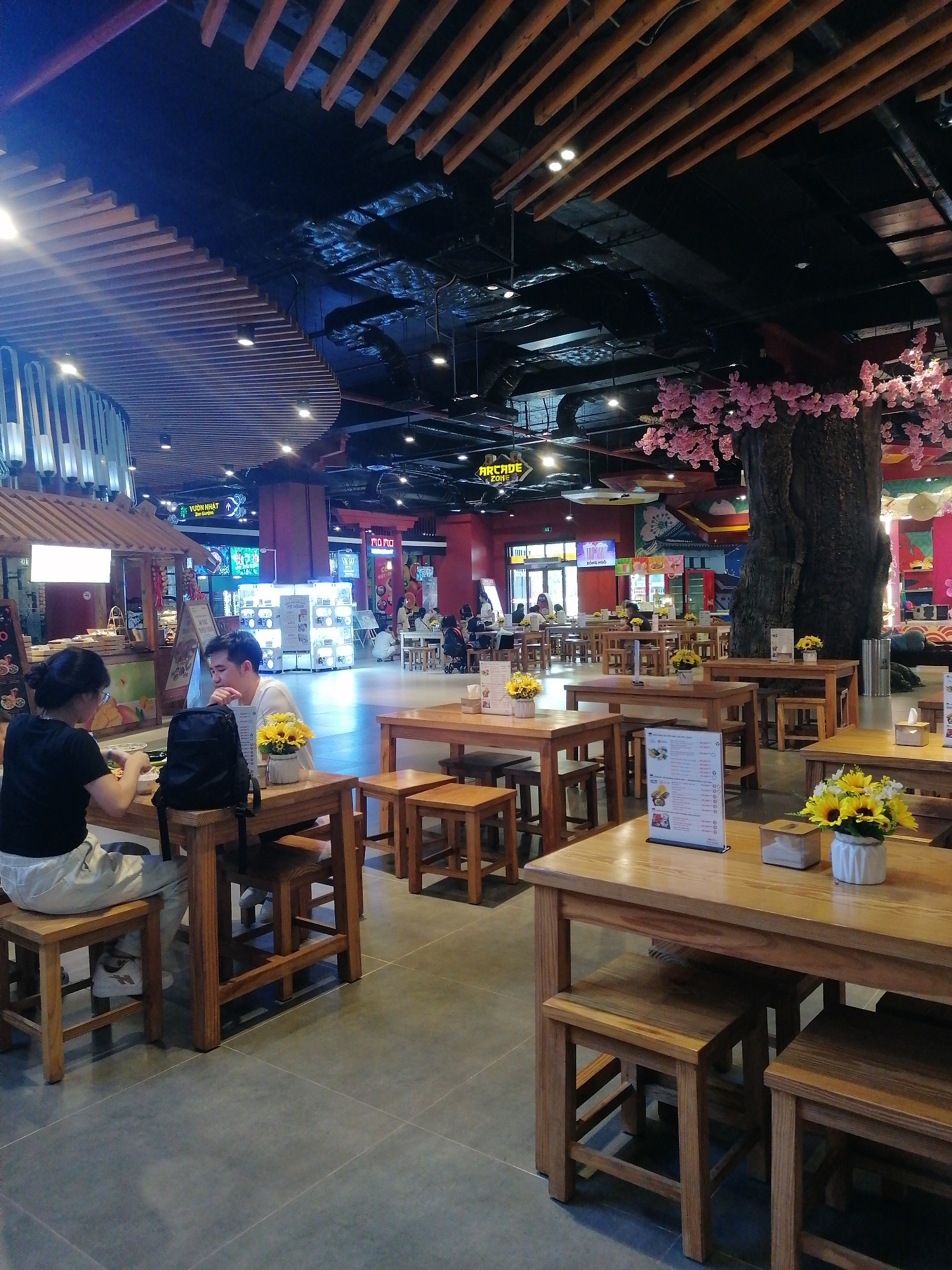 The image shows the interior of a food court in Hong Gai Ward, Vietnam. The space is well-lit with an assortment of wooden tables and chairs arranged for dining. A couple is seated at a table in the f…read more
