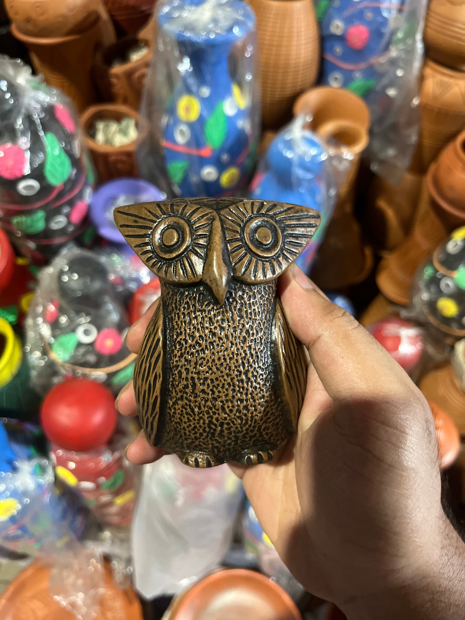 A hand holds a small, brown, owl-shaped handicraft. The owl is made of textured material with stylized eyes. The background is filled with a variety of pottery, some in plastic wrapping, and other han…read more