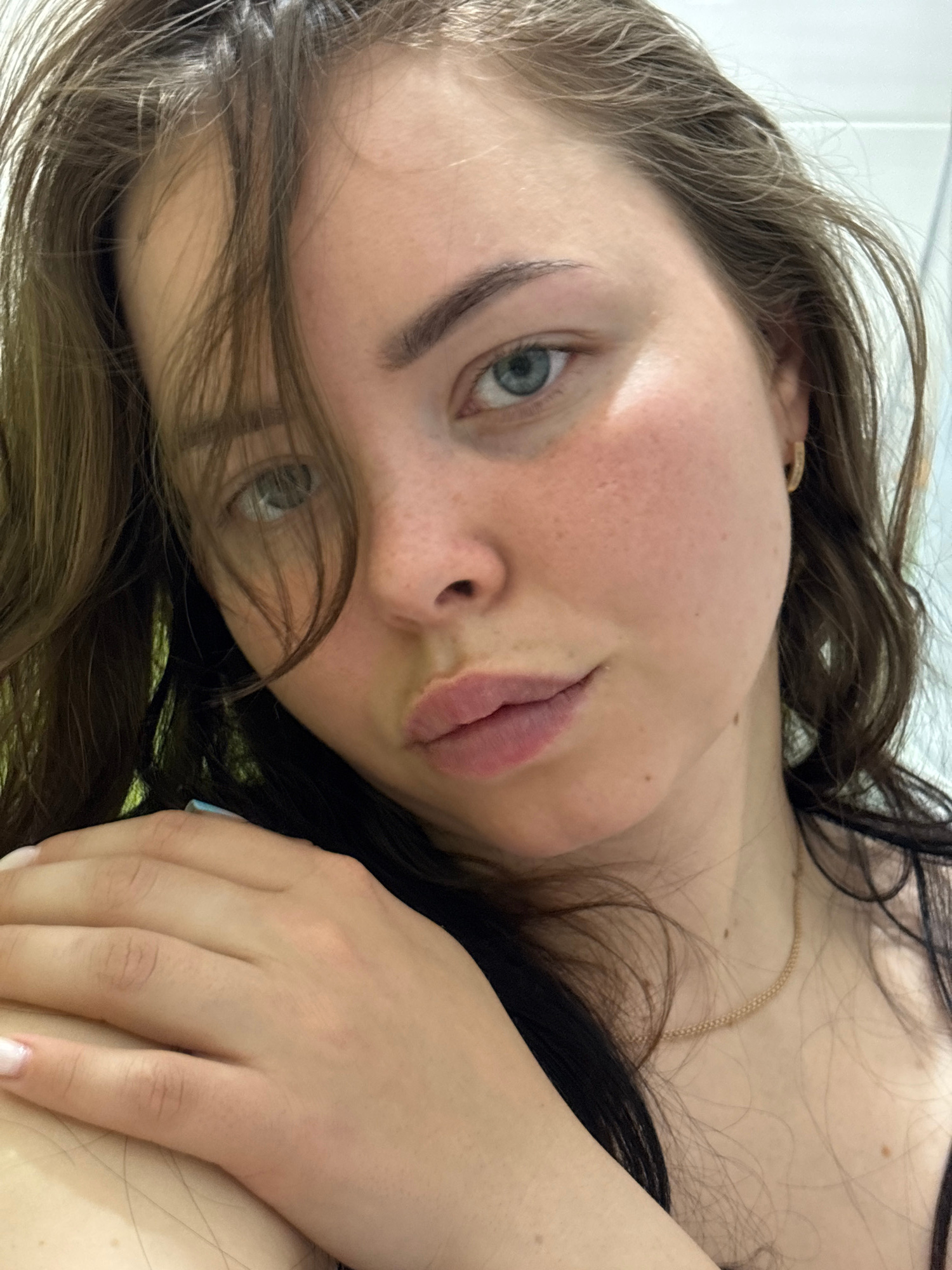 A close-up, high-angle portrait features a young person, likely female, lying down and looking directly into the camera. The image is oriented diagonally, with the person's head tilted. The subject h…read more