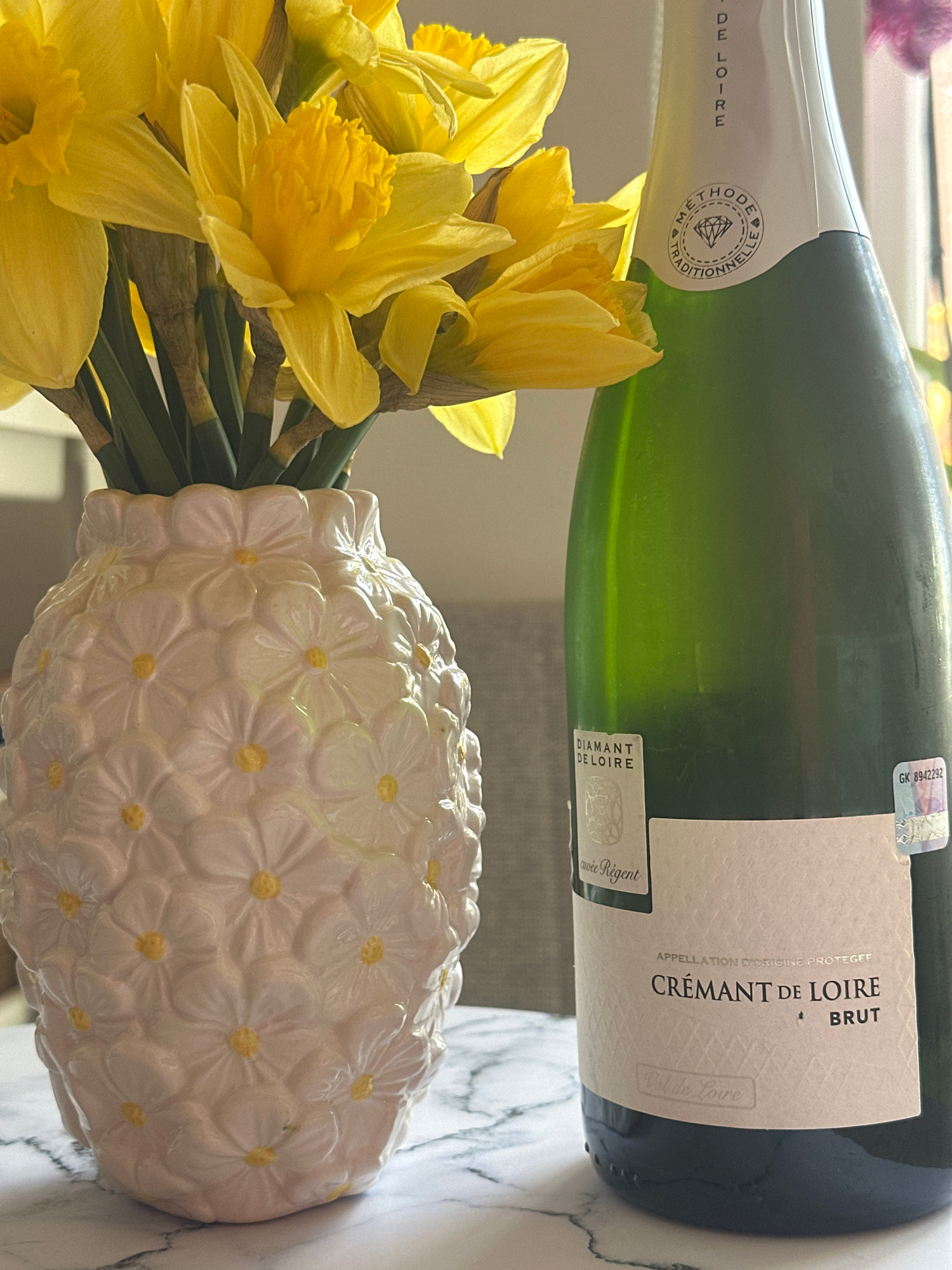 The image shows a bottle of "Crémant de Loire Brut" wine next to a vase of yellow daffodils. The wine bottle is green and has a white label. The vase is white with a floral pattern. The background app…read more