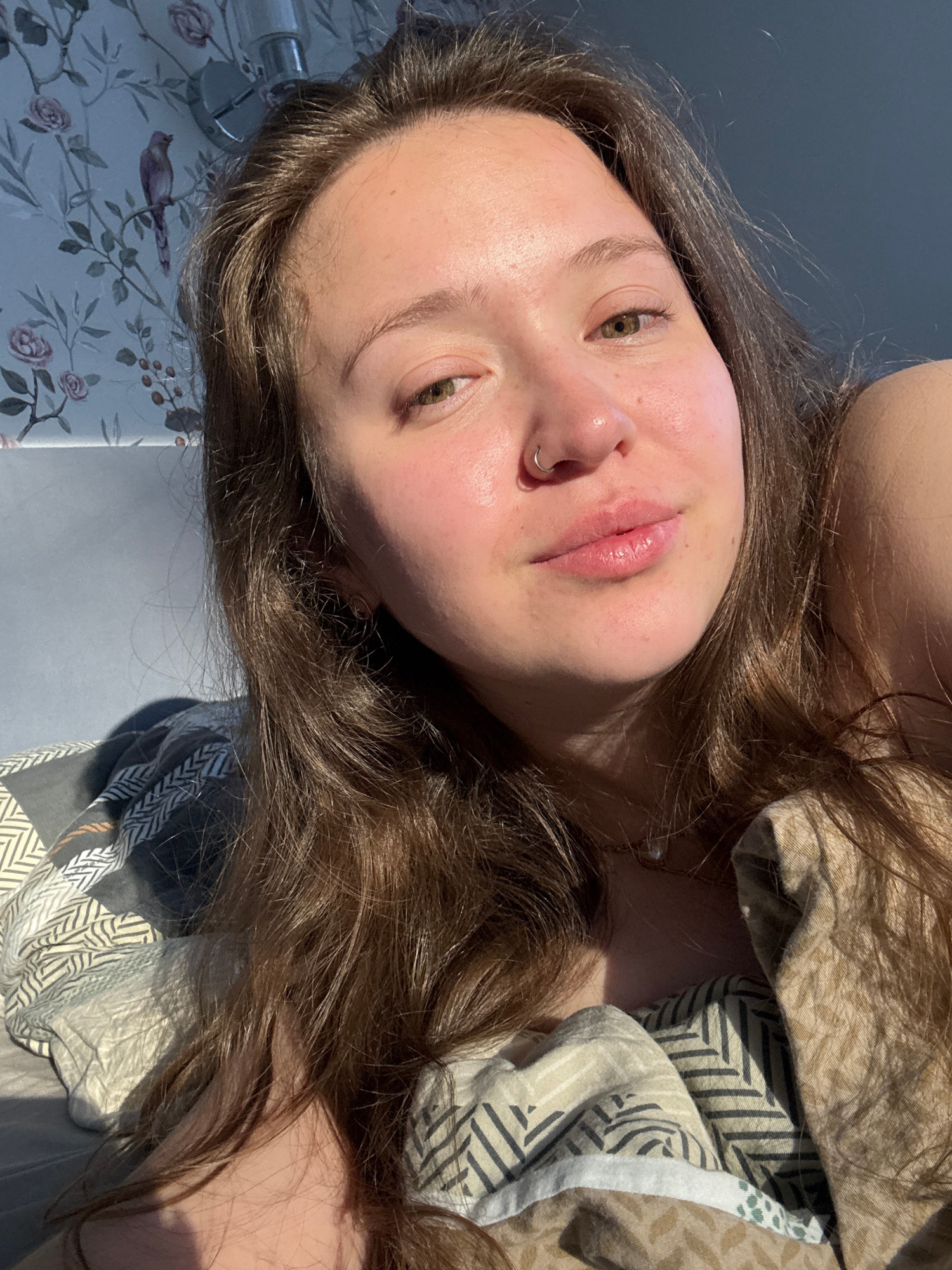 A selfie taken indoors, the subject is a fair-skinned person with brown hair and a nose ring. The person is partially covered by a blanket with a geometric pattern. A bedside table with a floral patte…read more