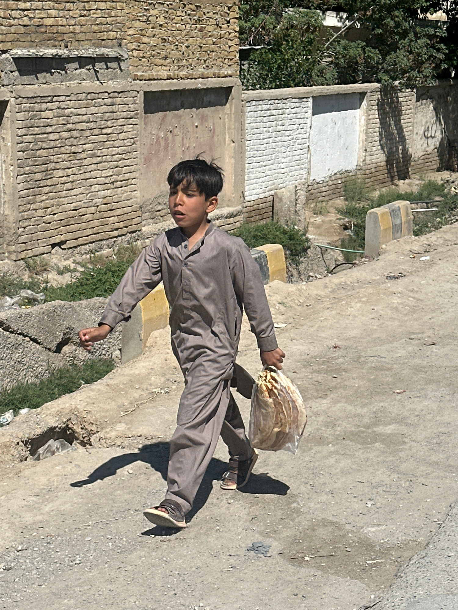 A young boy is walking along a paved road in what appears to be the Quetta City Tehsil, Pakistan. He is wearing a grayish-brown, long-sleeved jumpsuit and shoes. The boy is carrying a clear plastic ba…read more