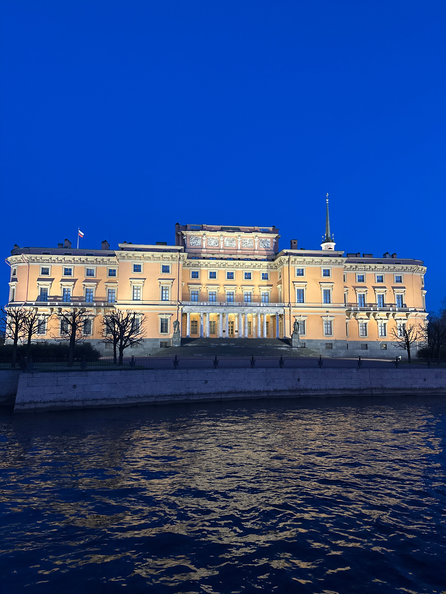 The image shows the Mikhailovsky Castle in Saint Petersburg, Russia. The castle's facade is cream-colored and features multiple windows, ornate architectural details, and a central tower with a spire.…read more