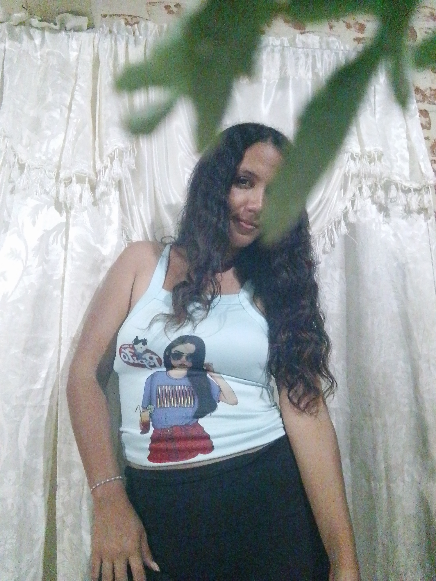A woman stands in front of a white curtain with a patterned valance, partially obscured by out-of-focus green foliage at the top of the frame. The woman has long, dark, wavy hair and is wearing a ligh…read more