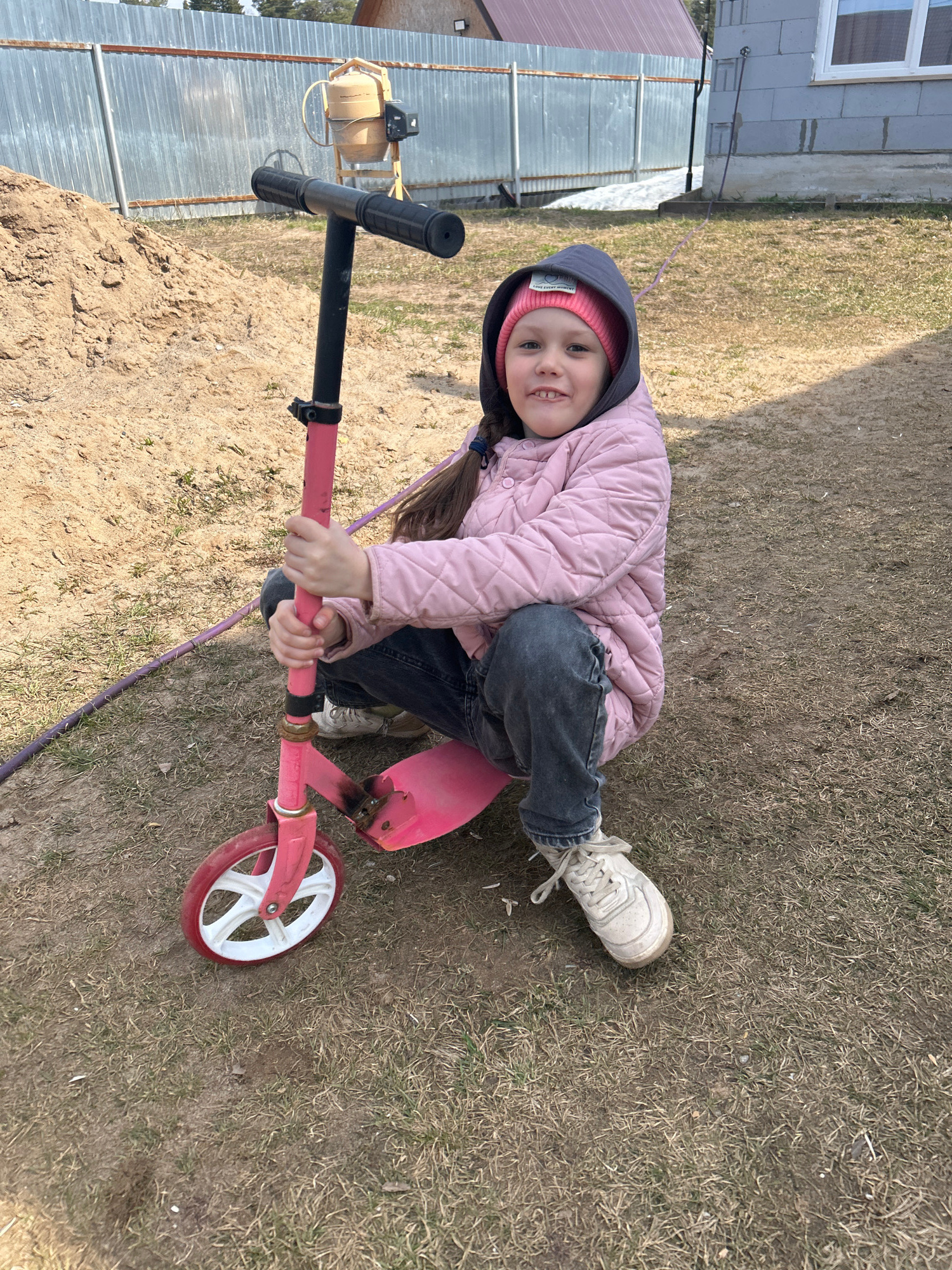 A young girl is depicted outdoors, sitting on a pink and black scooter with white wheels. She wears a pink quilted jacket, a dark hooded sweatshirt, dark pants, and white sneakers. A pink beanie with…read more