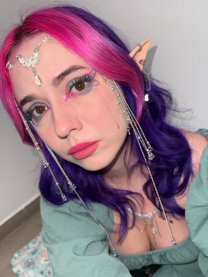 A person with vibrant pink and purple hair, adorned with elaborate silver jewelry around their head and forehead, poses with their head turned. They have pointed elf ears and a light green shirt. Thei…read more