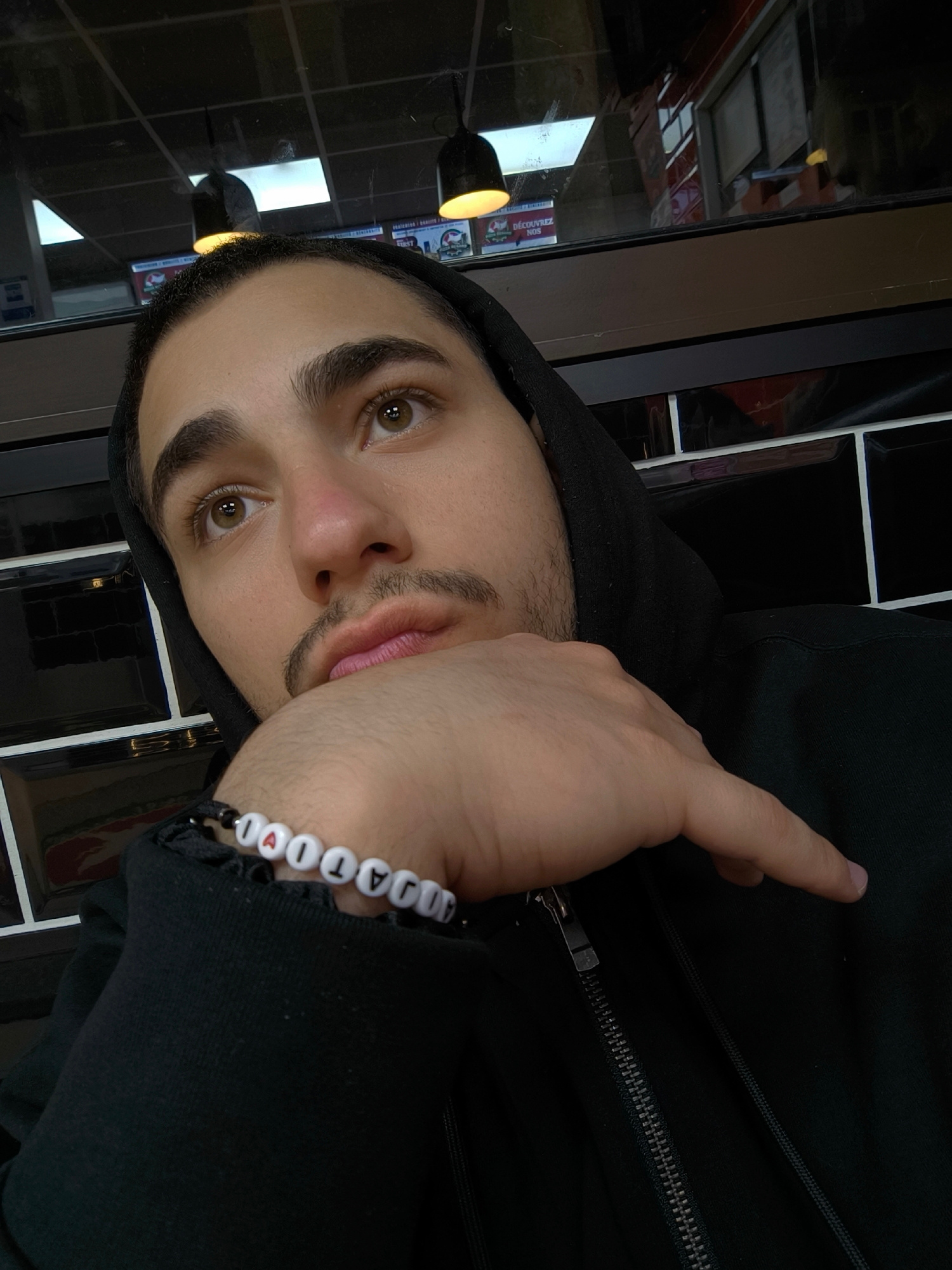 A young man is depicted in an eye-level, close-up shot, seemingly indoors. He is wearing a black hooded sweatshirt. A bracelet is visible on his wrist, containing letter beads spelling out "AJATIOLA".…read more