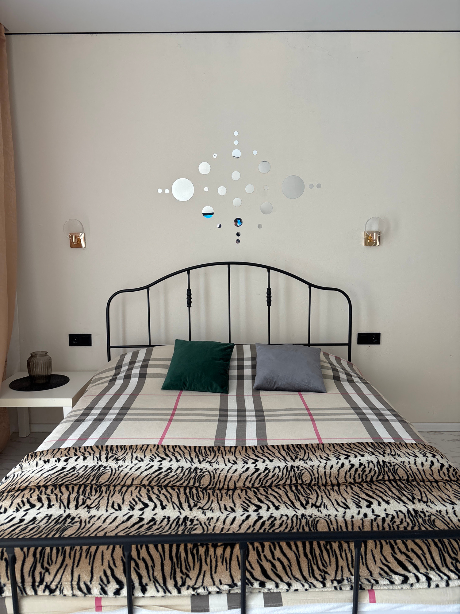 The image shows a bedroom interior. A black metal bed frame with a plaid duvet cover and an animal print throw is visible. Two pillows, one gray and one dark green, are on the bed. The wall behind the…read more