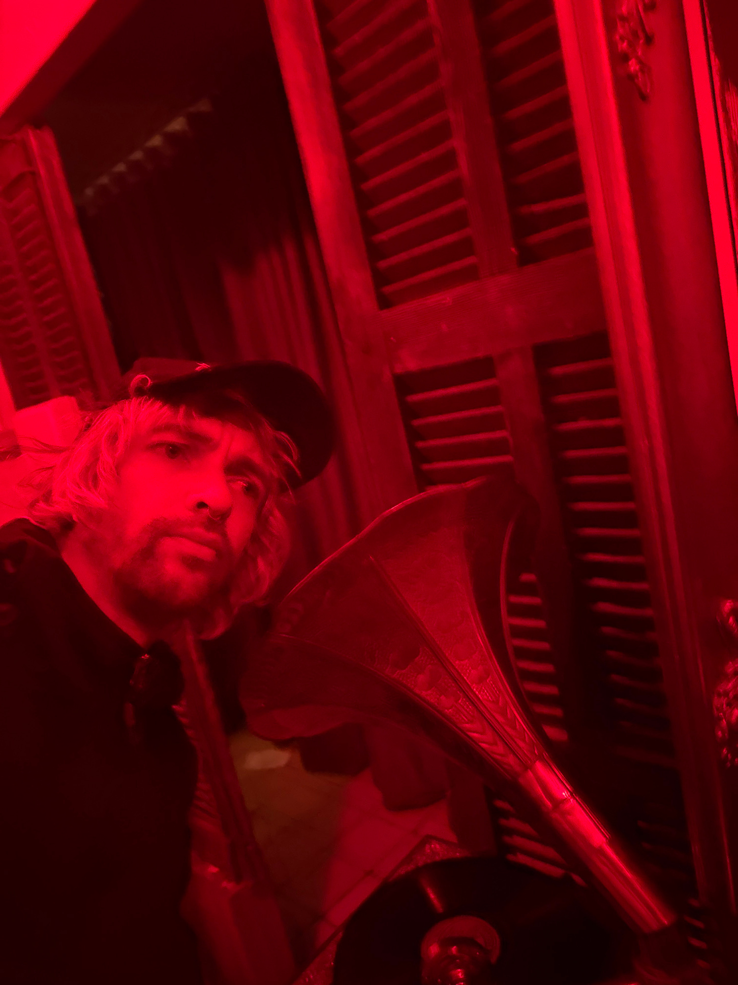The image, bathed in a strong red light, presents a low-angle shot. It captures a person with shoulder-length, light-colored hair wearing a dark baseball cap. Positioned above and slightly behind the…read more