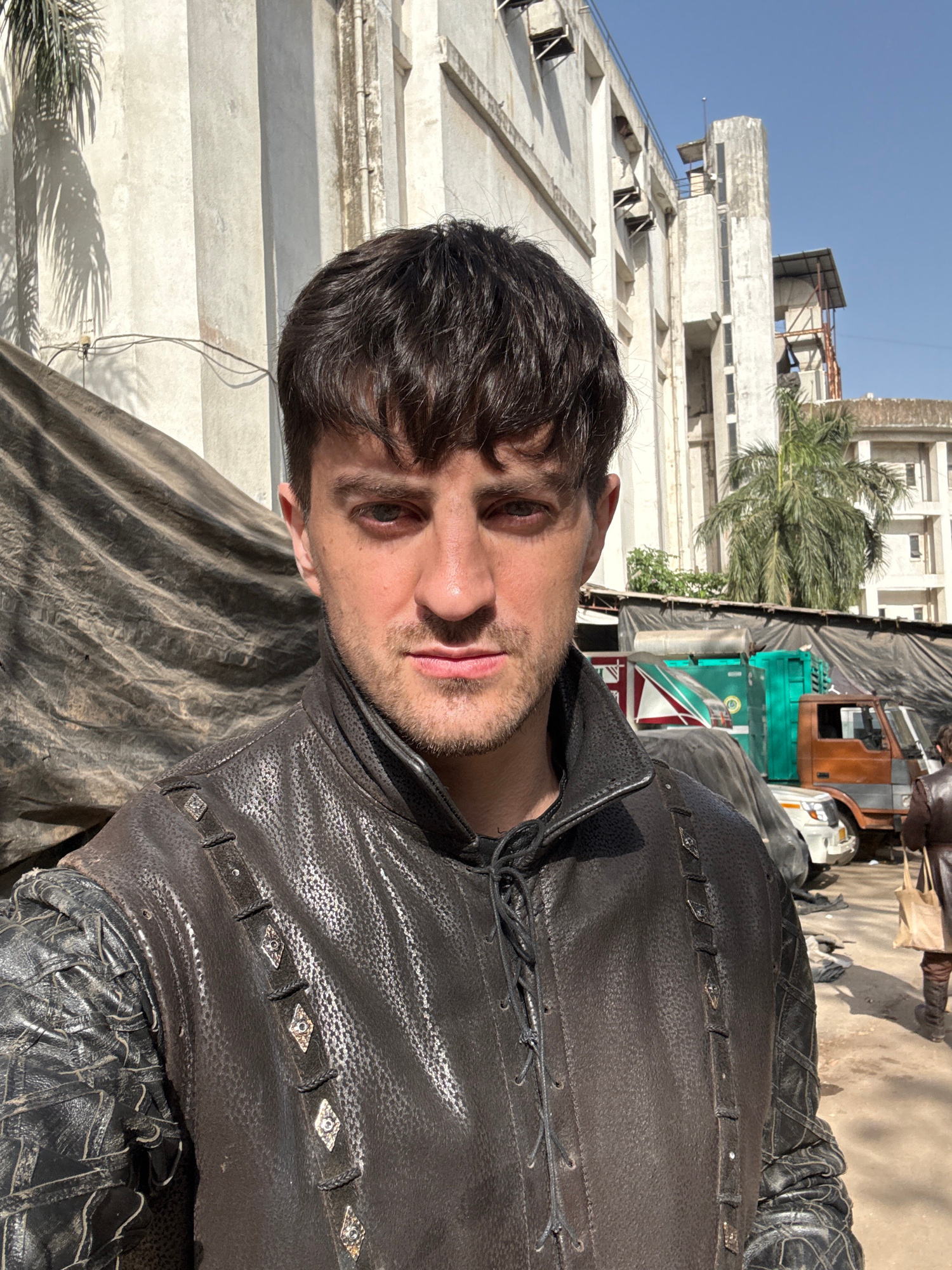 The image shows a man with short, dark hair and a slight beard, wearing a dark leather jacket with decorative stitching and embellishments. He appears to be in an urban environment, with white buildin…read more